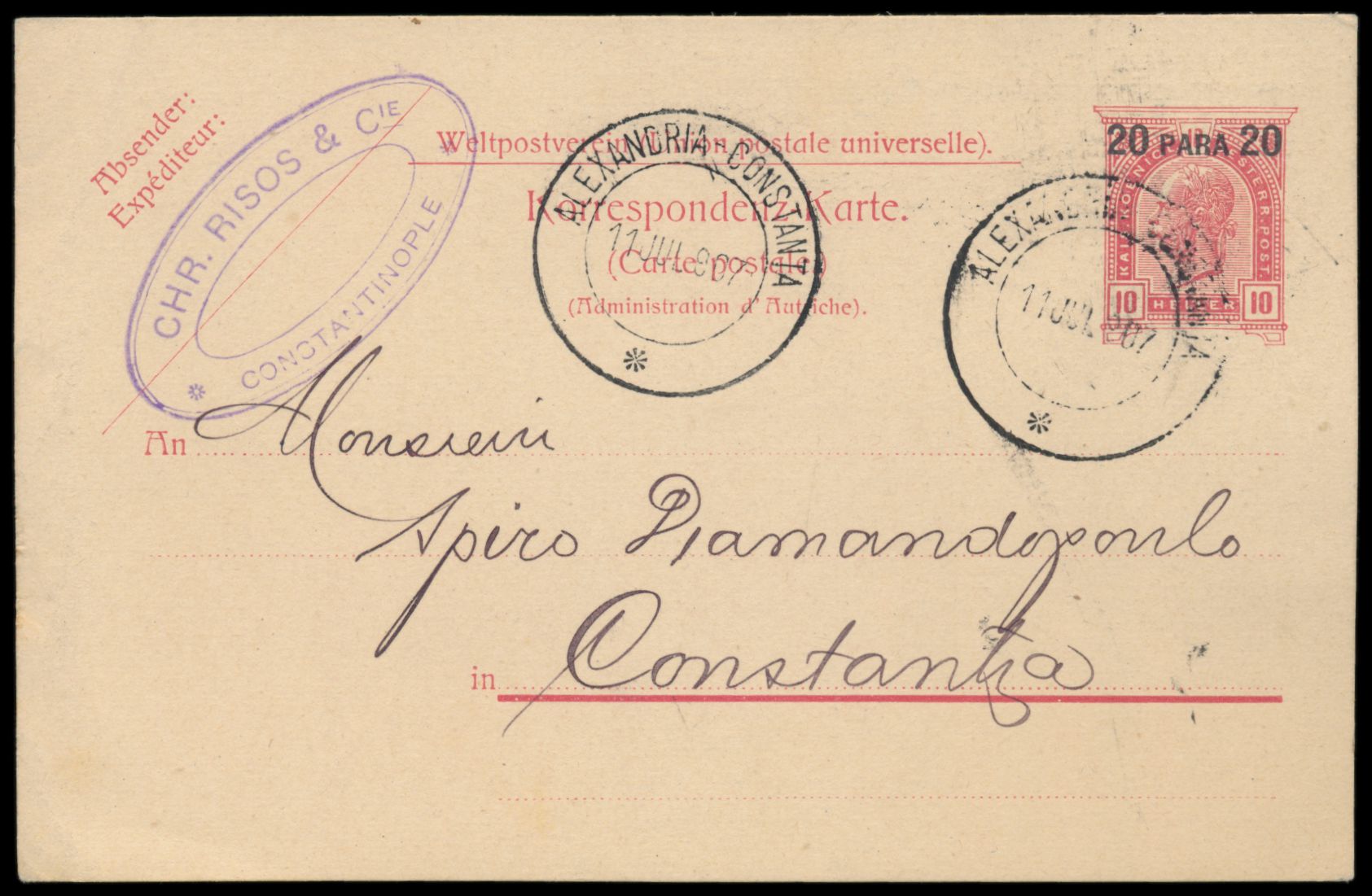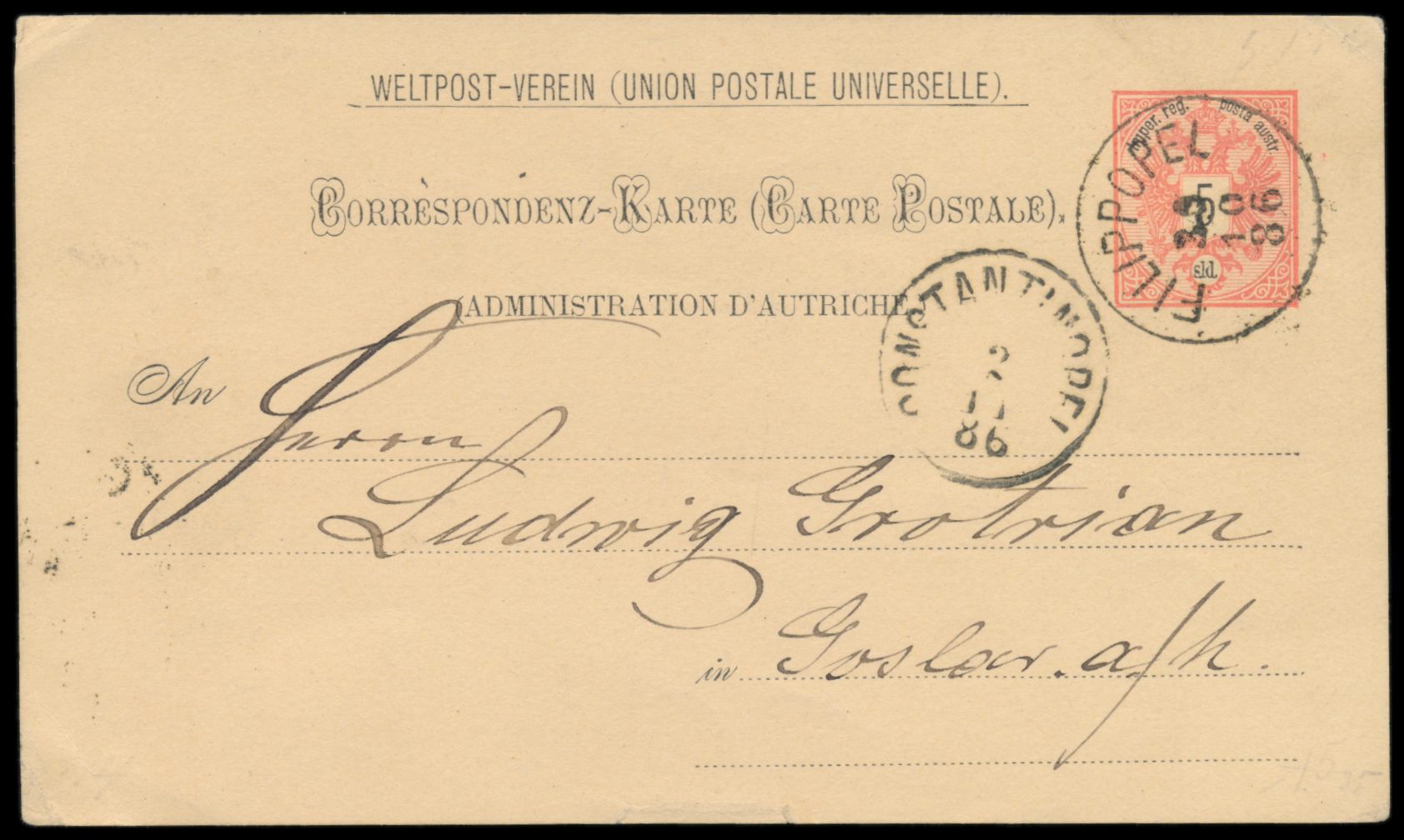 Levante, Ganzsache 5 Soldi (Ausgabe 1883) mit Stempel Filipopel 30.10.86 nach Deutschland, Durchgangsstempel Constantinopel 2.11.86, Bedarf