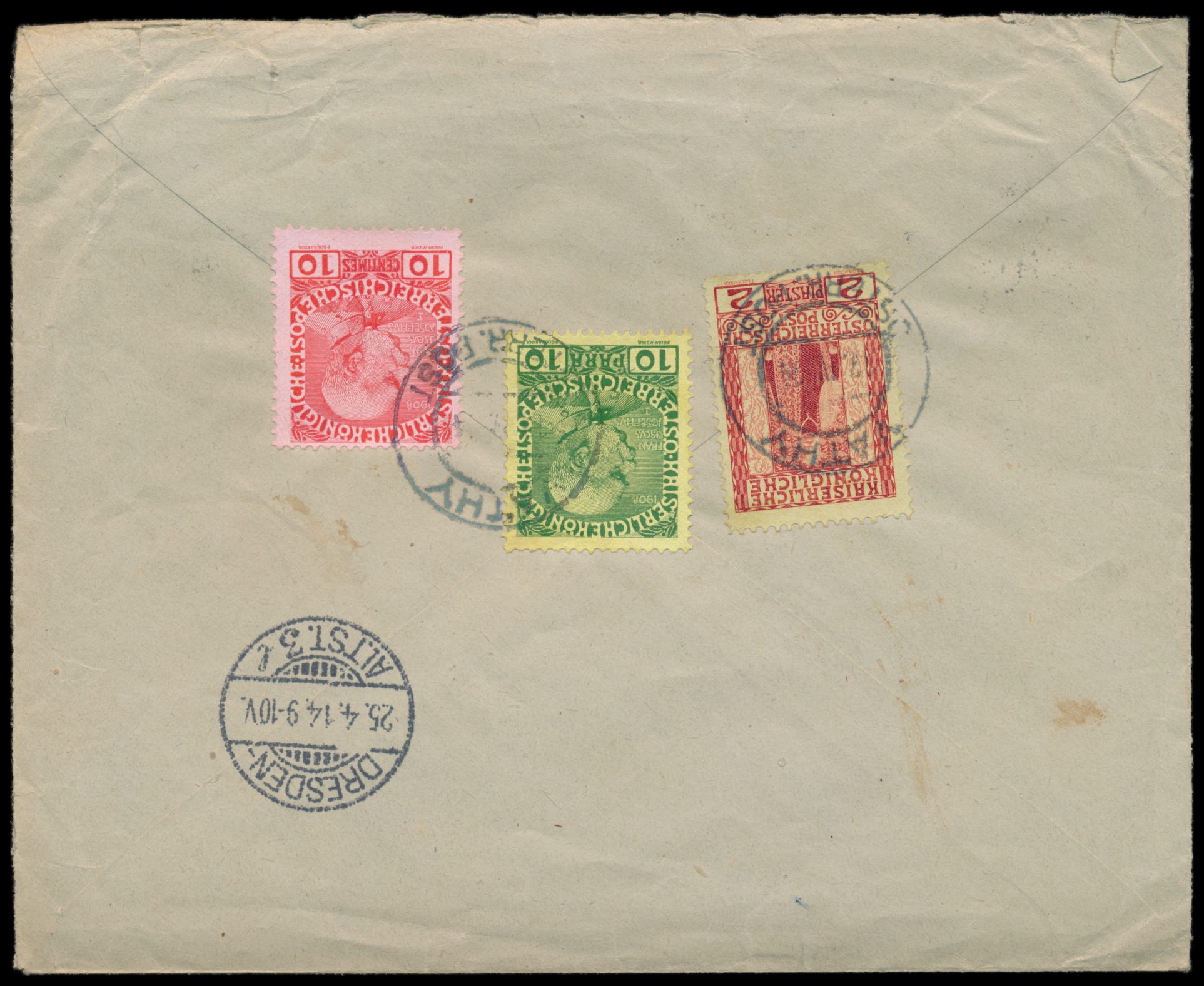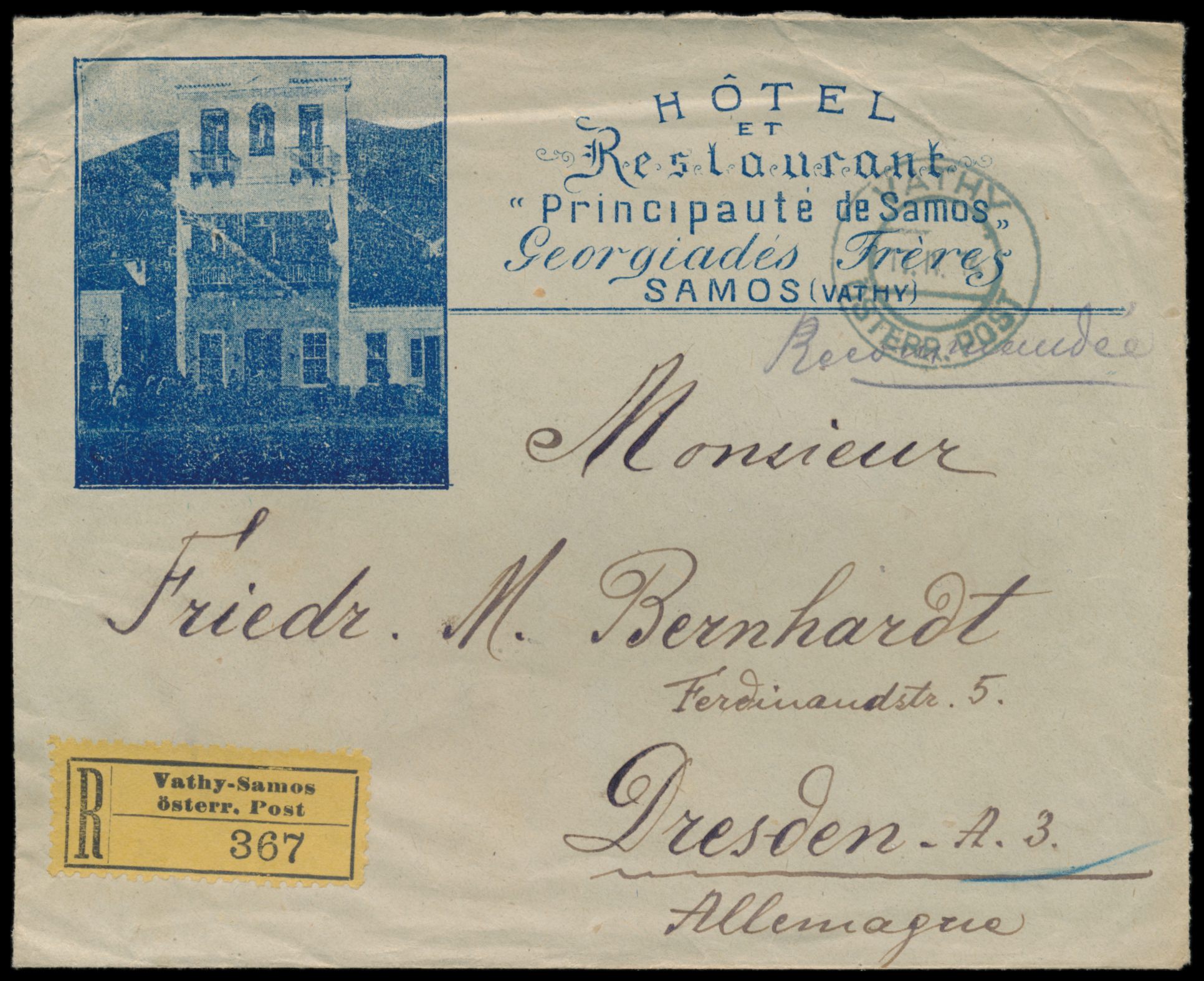 Levante, Ausgabe 1908: 10 Pa., 10 C. und 2 Pia. als Währungsmischfrankatur rückseitig auf Reklameumschlag "Hôtel et Restaurant Principaute de Samos" als Einschreiben nach Deutschland, Stempel Vathy 17.4.14, Ankunftstempel Dresden 25.4.14, Umschlag ist dreiseitig offen, Bedarf