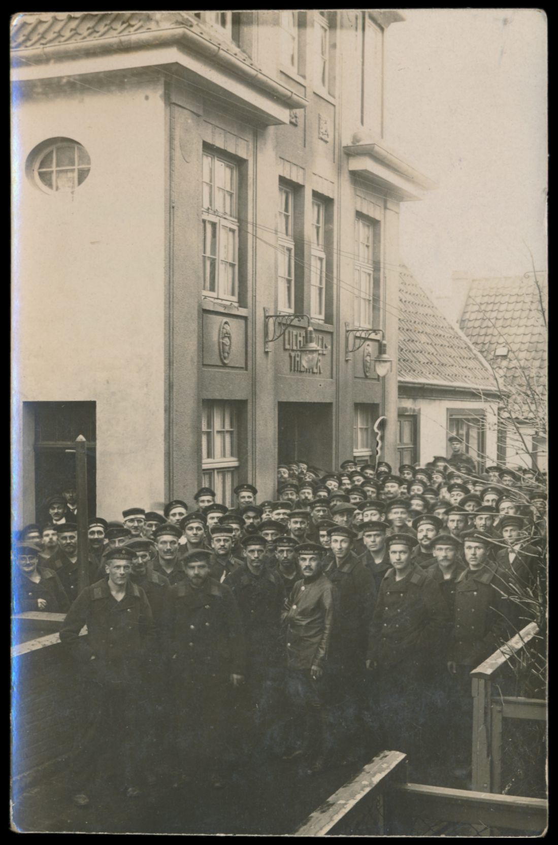Helgoland, Fotoansichtskarte einer Matrosengruppe vor dem Lichtspieltheater, Briefstempel Kaiserliche Marine 5. Kompagnie V. Matr.-Artl.-Abtlg., geschrieben am 25.2.1915, Feldpost nach Elsfleth
