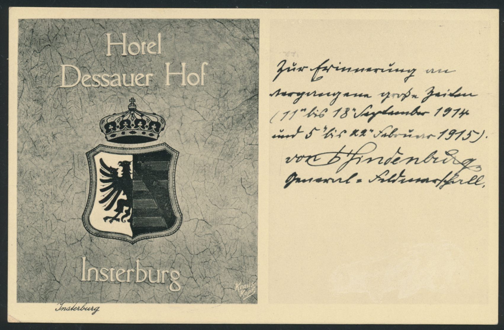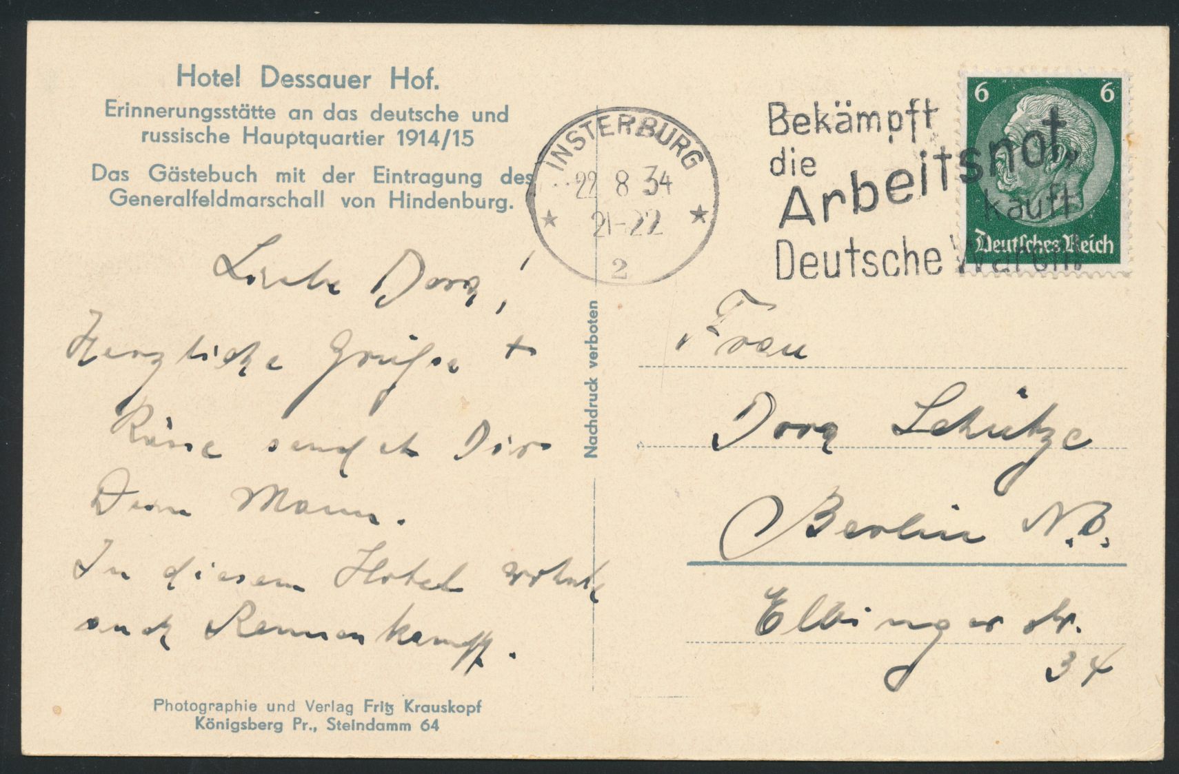 Insterburg, Hotel Dessauer Hof, mit gedrucktem Text Hindenburg zur Erinnerung 1914 ..., Frankatur 6 Pfg. Hindenburg, Maschinenstempel Insterburg 27.8.34, Bedarf nach Berlin, kleiner Klebefleck unter dem Text