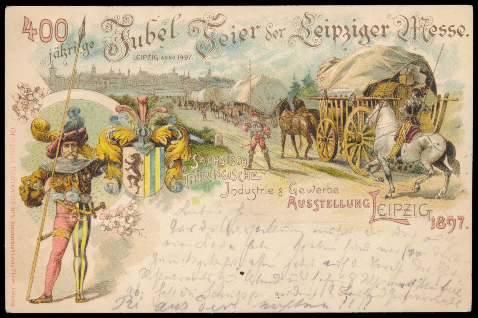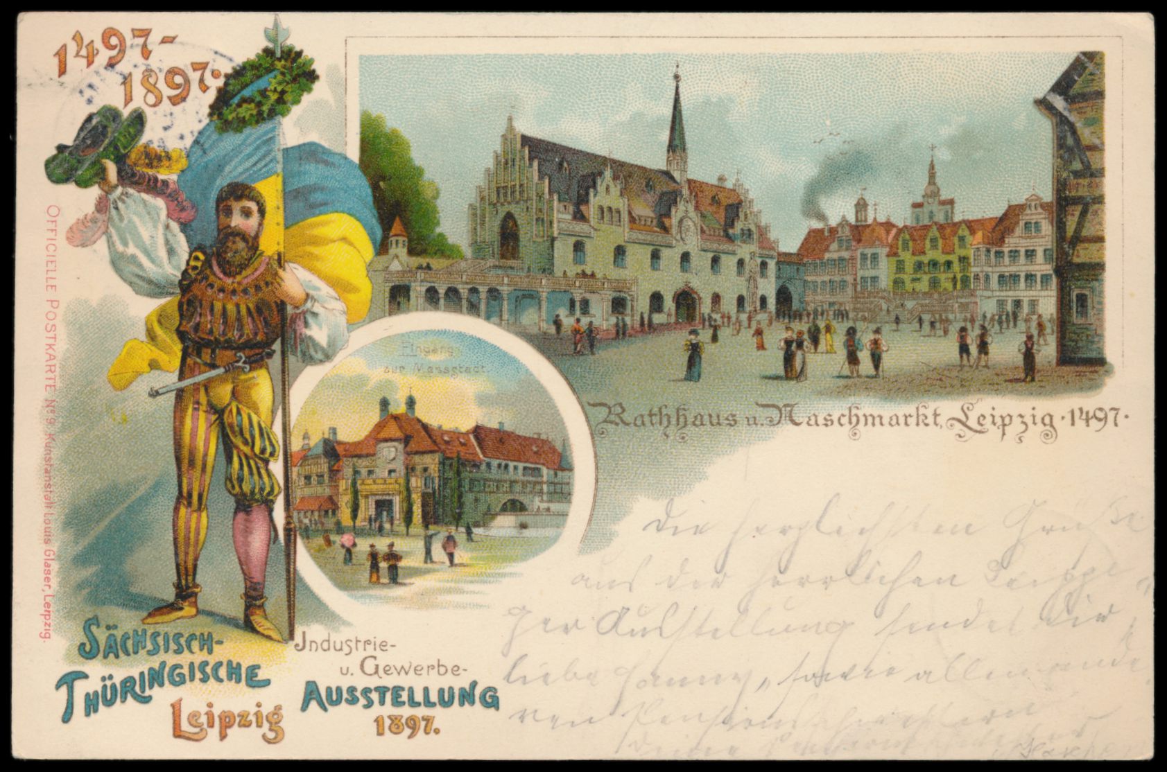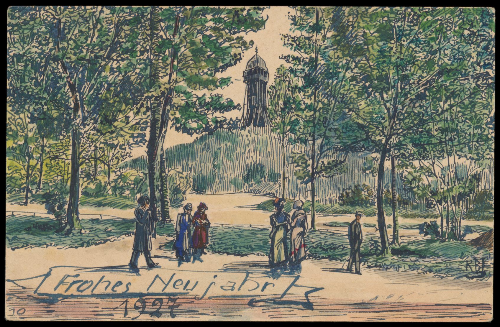 Leipzig, Postkarte mit Tinten- und Tuschezeichnung einer Parkszene, mehrfarbig, monogrammiert "RBI" (?), Frankatur 8 Pf., Stempel Leipzig 31.12.27, nach Bautzen