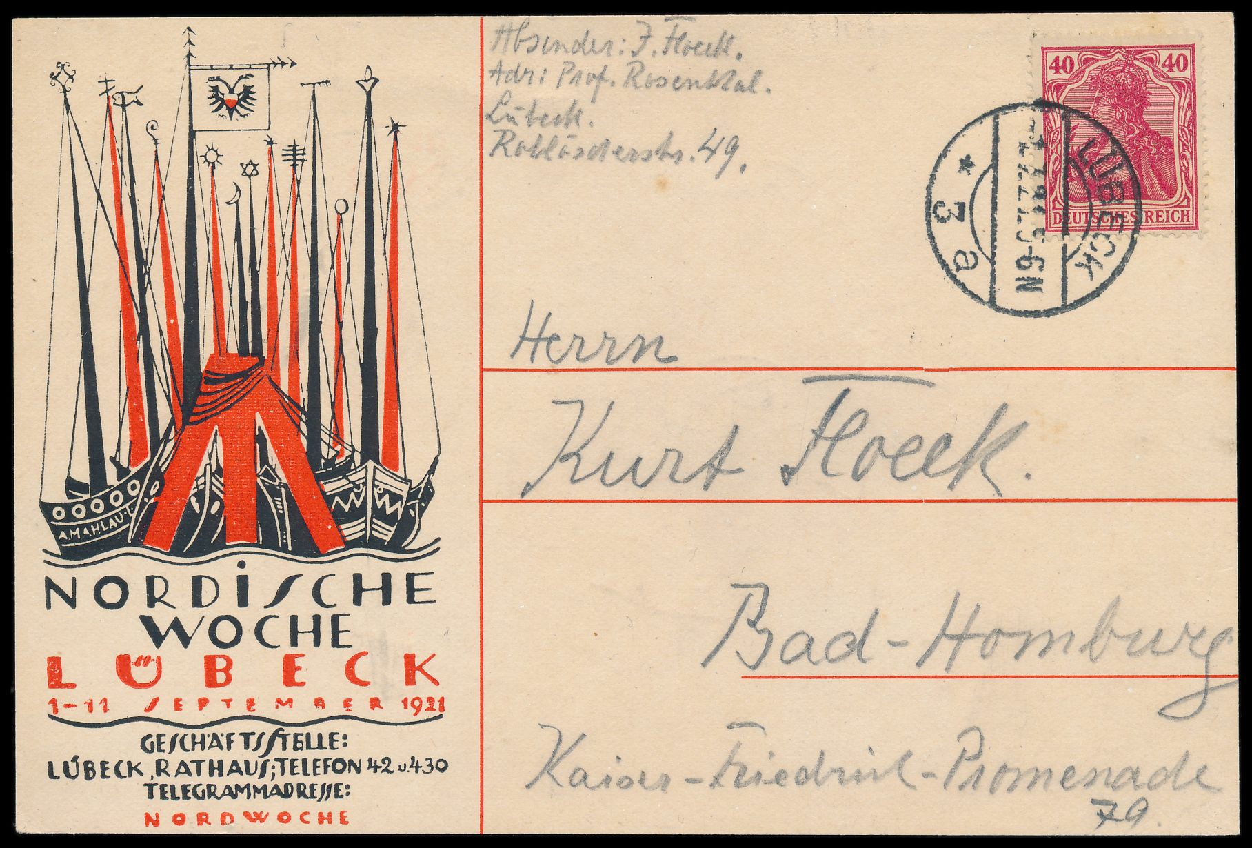 Nordische Woche Lübeck 1921, Werbekarte mit dem Plakatentwurf von Alfred Mahlau (1894 - 1967), Frankatur 40 Pf., Stempel Lübeck 3 1.7.21, nach