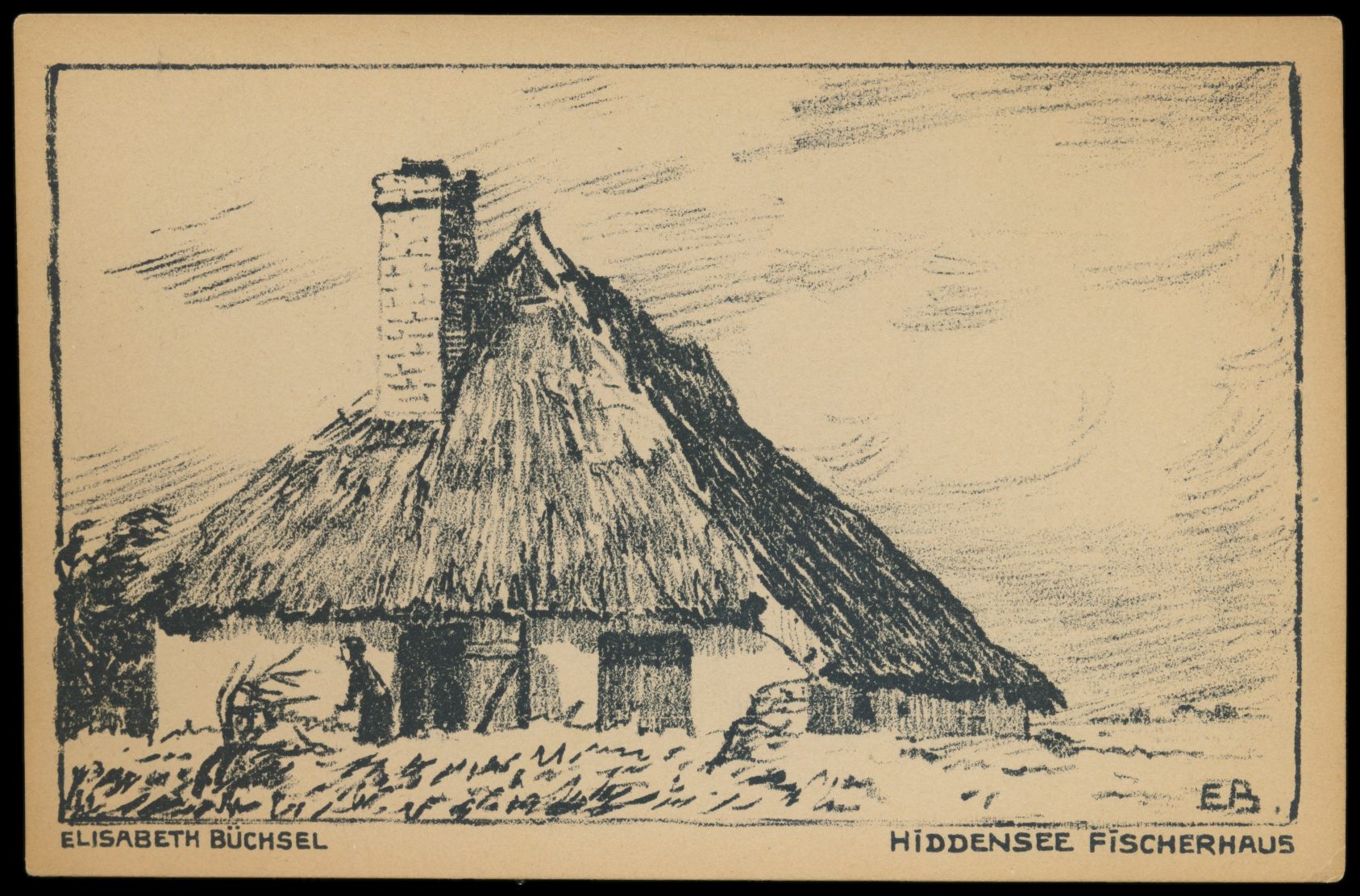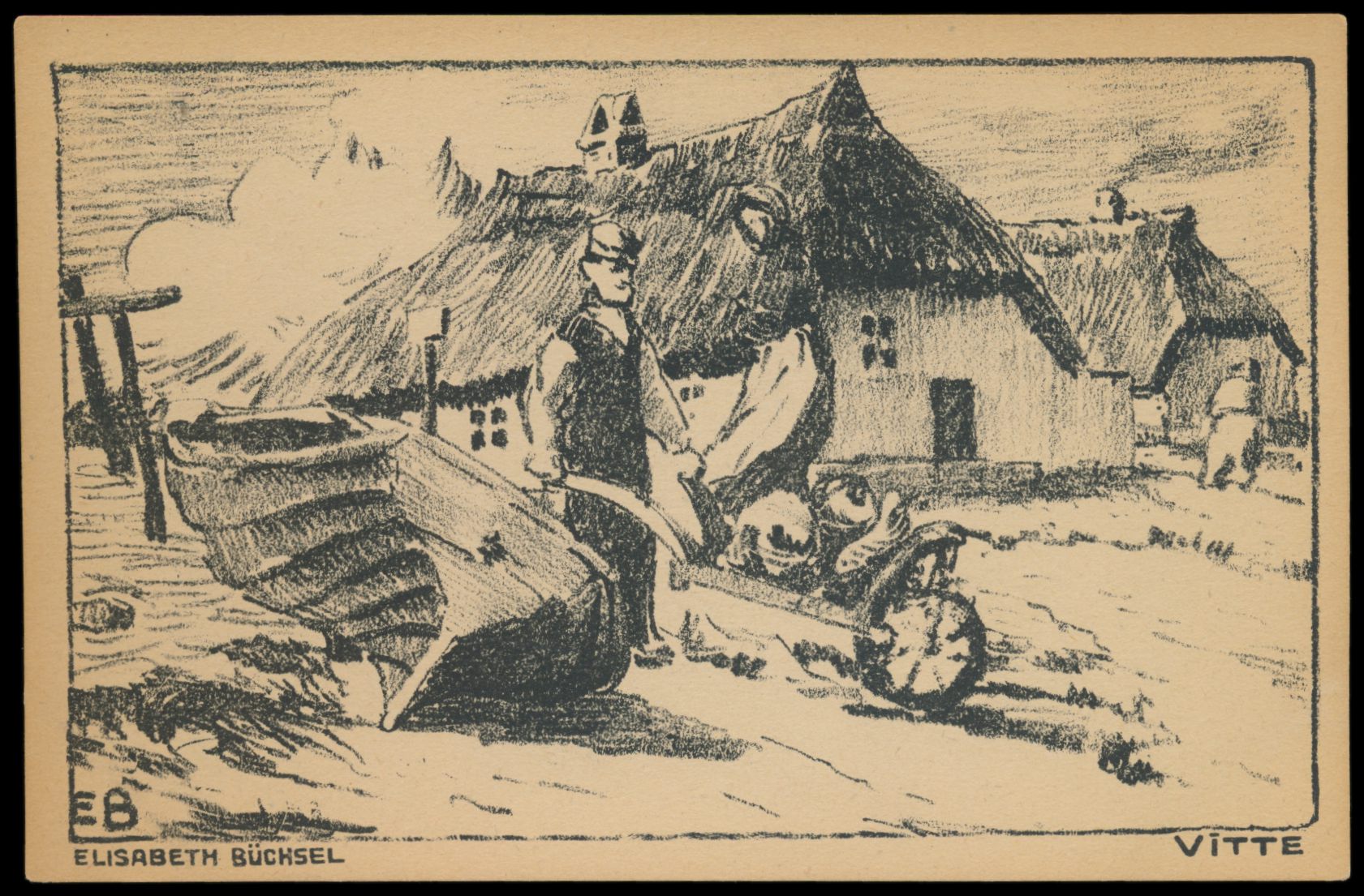 Rügen, 8 verschiedene Postkarten mit Bildern von Vitte, Hiddensee, Neuendorf usw., Schwarz-Zeichnungen signiert von Elisabeth Büchsel , Hiddenseer Künstlerinnenbund (1867-1957), Druck Litho-Anstalt Hubert Köhler, München, ungebraucht, ca. 1915
