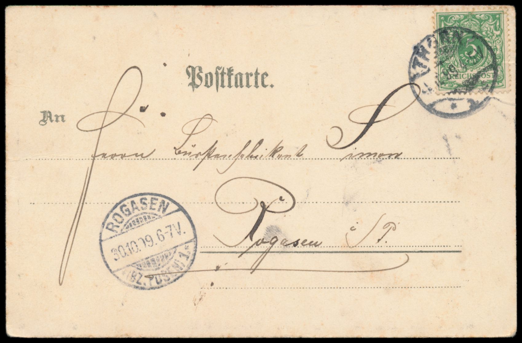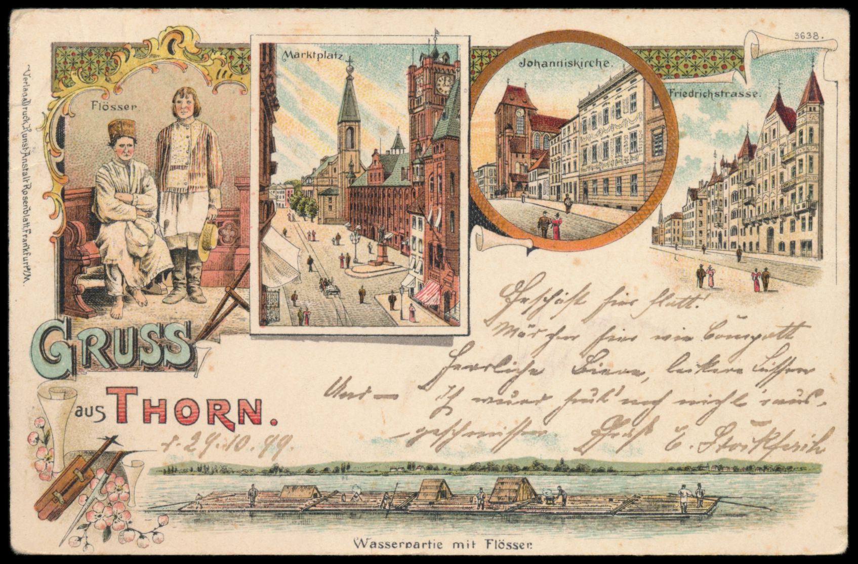 Thorn, Westpreußen, Litho-Ansichtskarte mit fünf Teilbildern, u.a. Flösser auf der Weichsel, Frankatur 5 Pfg. Krone/Adler, Stempel Thorn 29.10.99, Ankunftstempel Rogasen, Bedarf