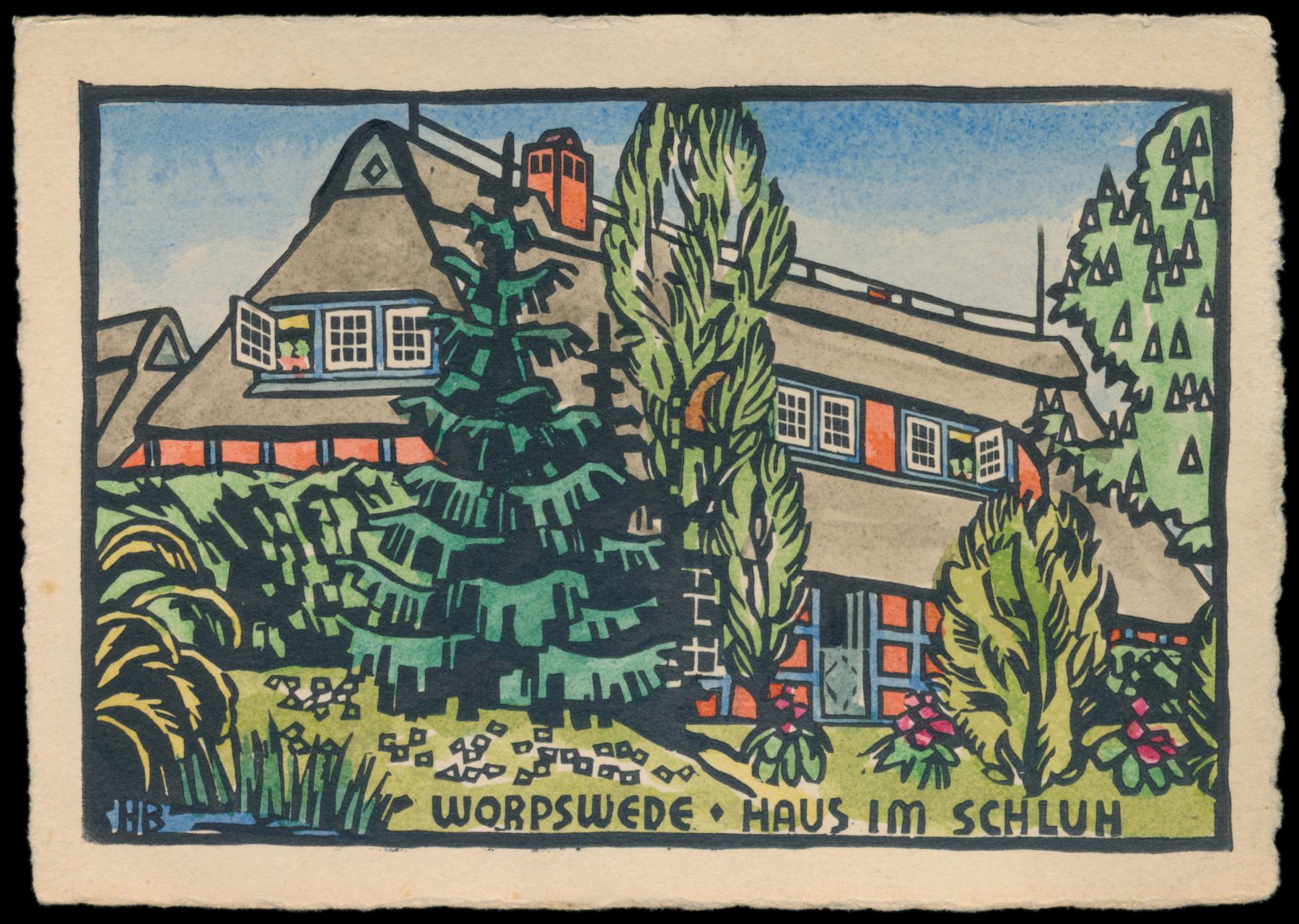 Worpswede - Haus am Schluh (Wohnhaus von Heinrich Vogeler), Holzschnitt von H. Bogenrieder, Signatur "HB", mehrfarbig aquarelliert, ca. 1950, ungelaufen