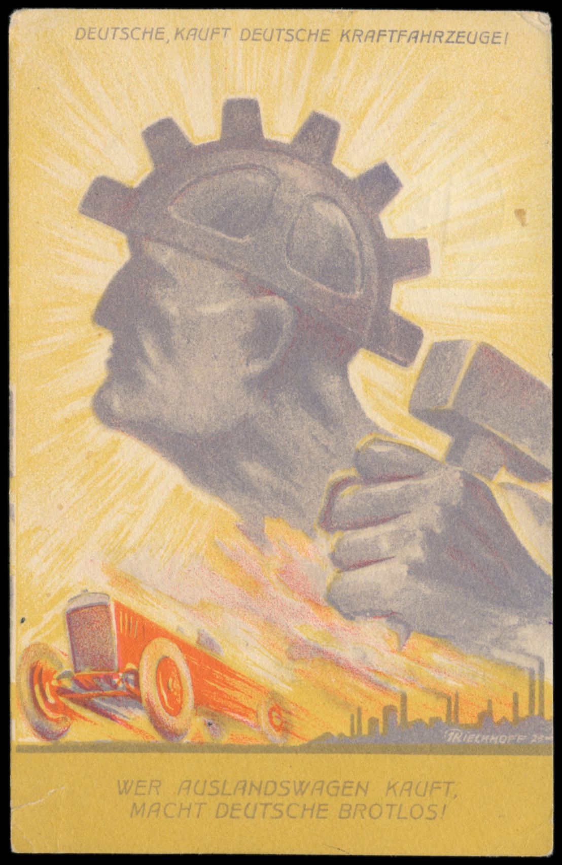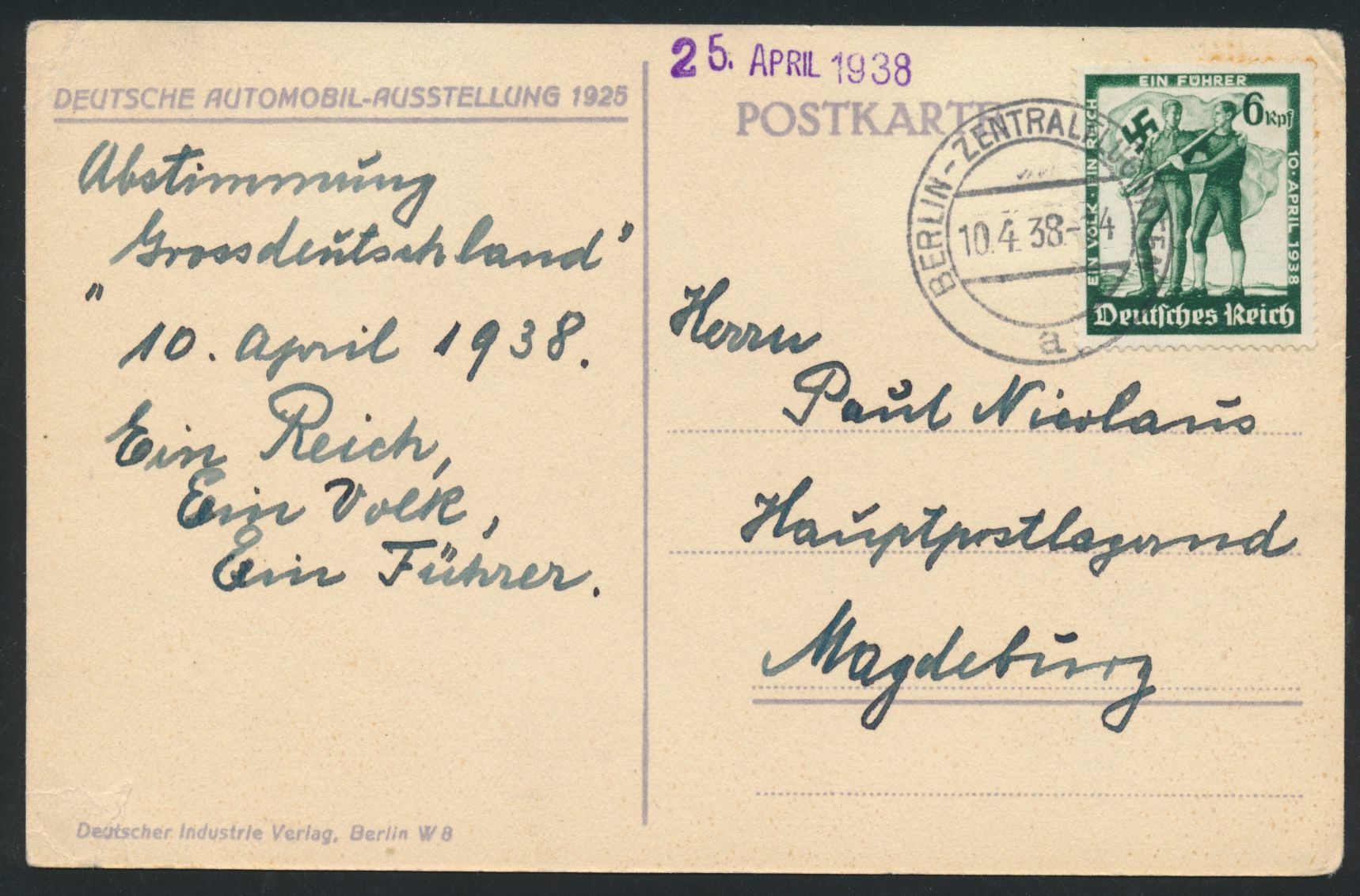 Automobilausstellung 1925: seltene Sonderkarte "Deutsche, kauft deutsche Kraftfahrzeuge -Wer Auslandswagen kauft, macht Deutsche brotlos", mit 6 Pfg. Volksabstimmung, Stempel Berlin Zentralflughafen 10.4.38, mit Grußtext nach Magdeburg, seltene Karte, kleiner Randriss unten