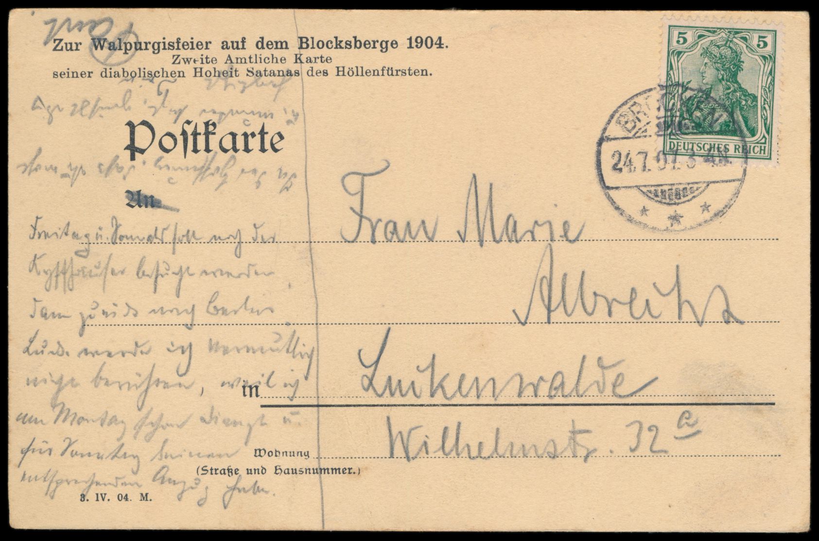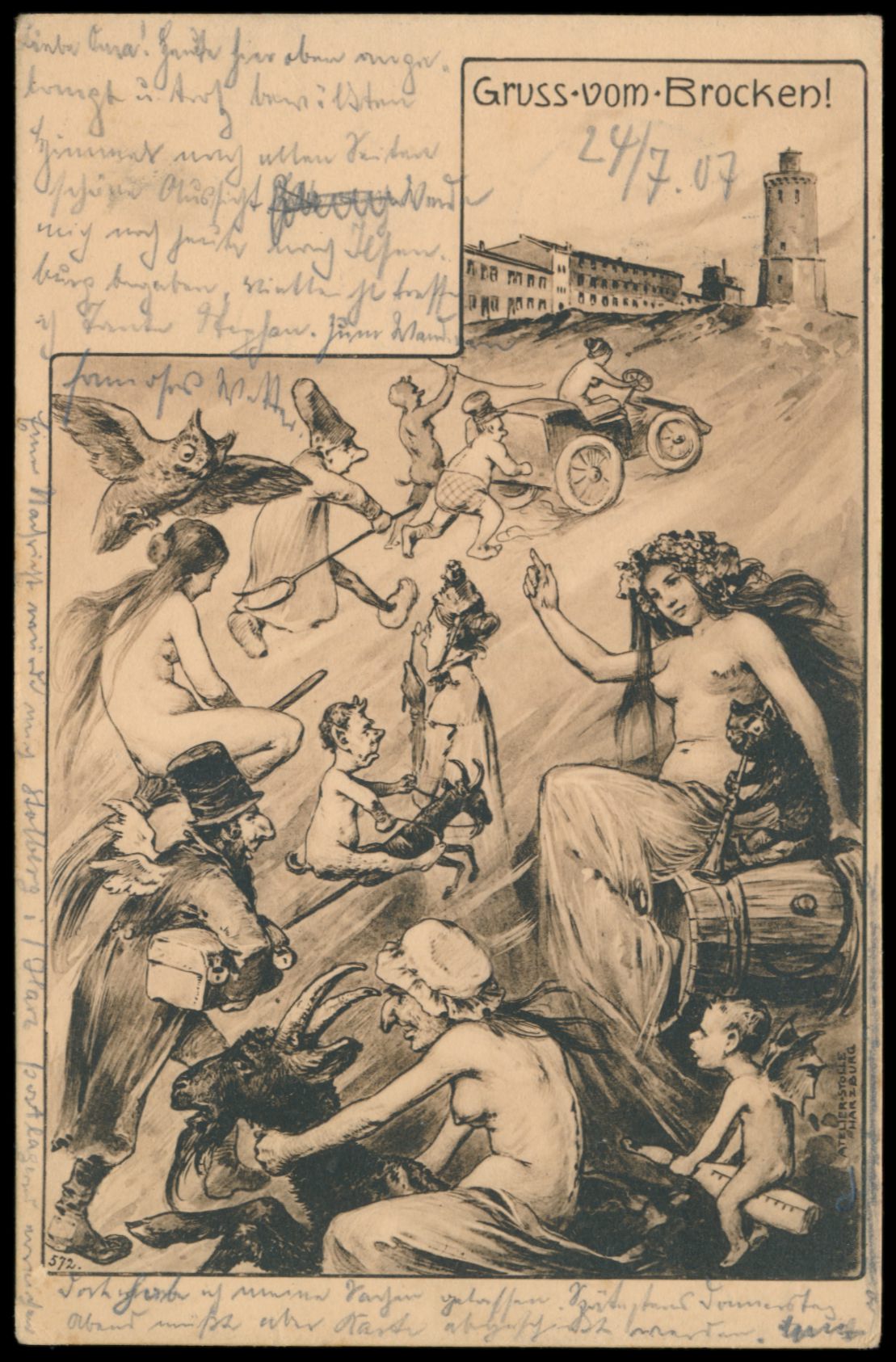 Gruss vom Brocken: "Zur Walpurgisfeier auf dem Blocksberge 1904. Zweite Amtliche Karte seiner diabolischen Hoheit Satanas des Höllenfürsten.", Walpurgisnacht-Szene mit u.a. antisemitischer Karikatur, Frankatur 5 Pf., Stempel Brocken 24.7.07, nach Luckenwalde