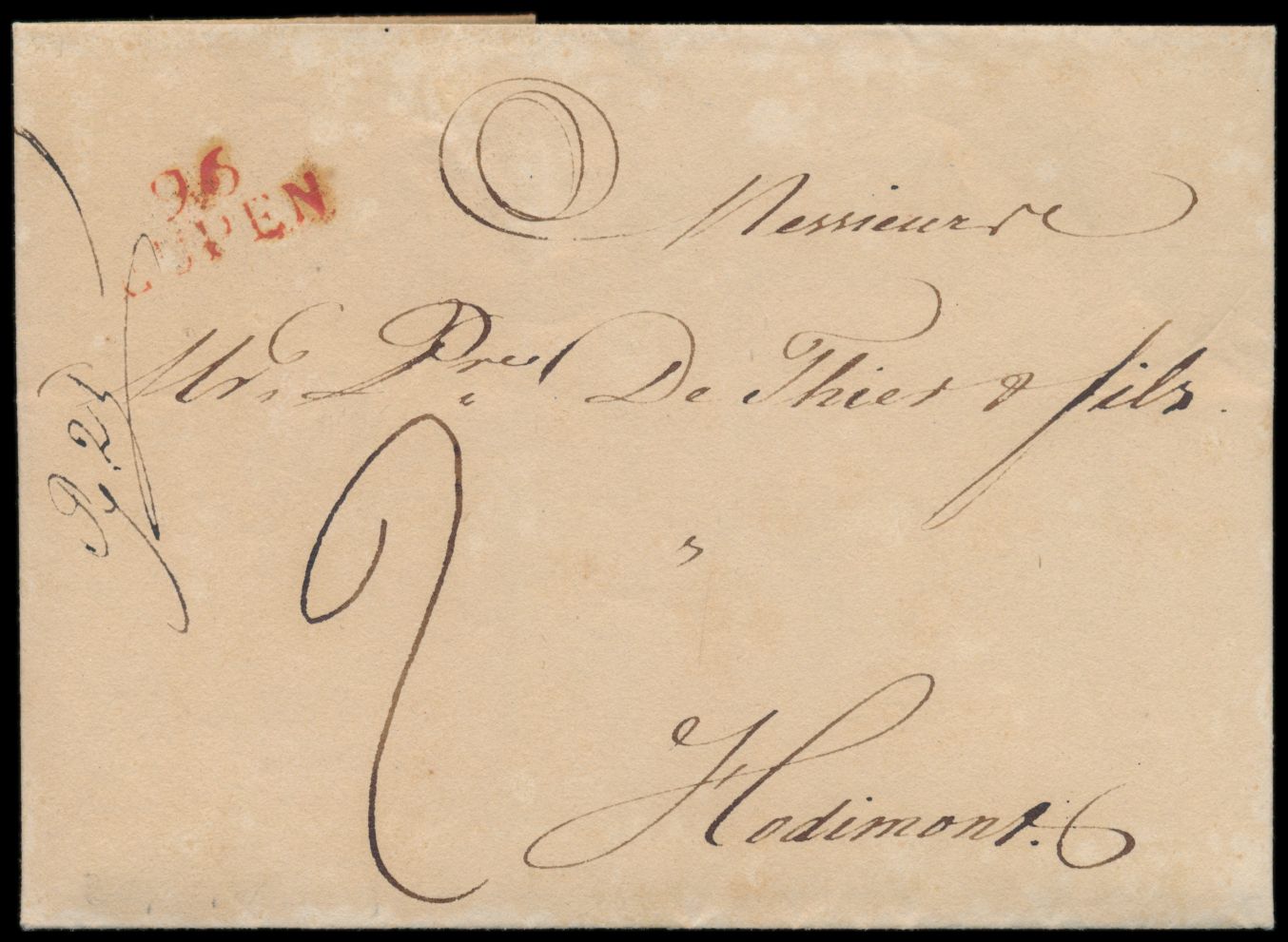 roter Département-Stempel 96 Eupen auf Faltbrief nach Hodimont, mit komplettem Inhalt vom 21.1.1809