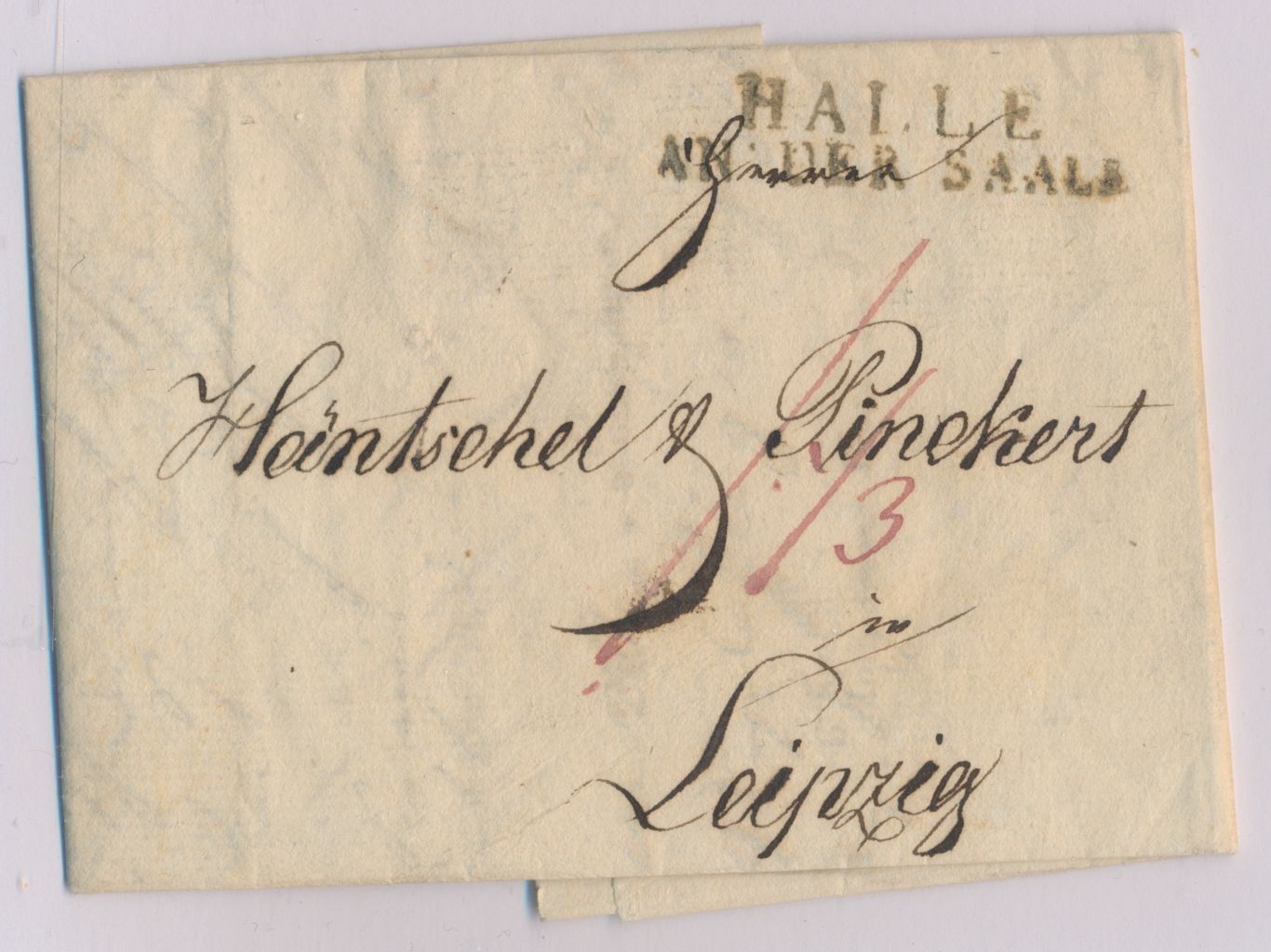 Königlich Westphälische Post, Faltbrief mit L2 Halle / An der Saale nach Leipzig, roter Portovermerk, mit komplettem Inhalt vom 19.10.1811