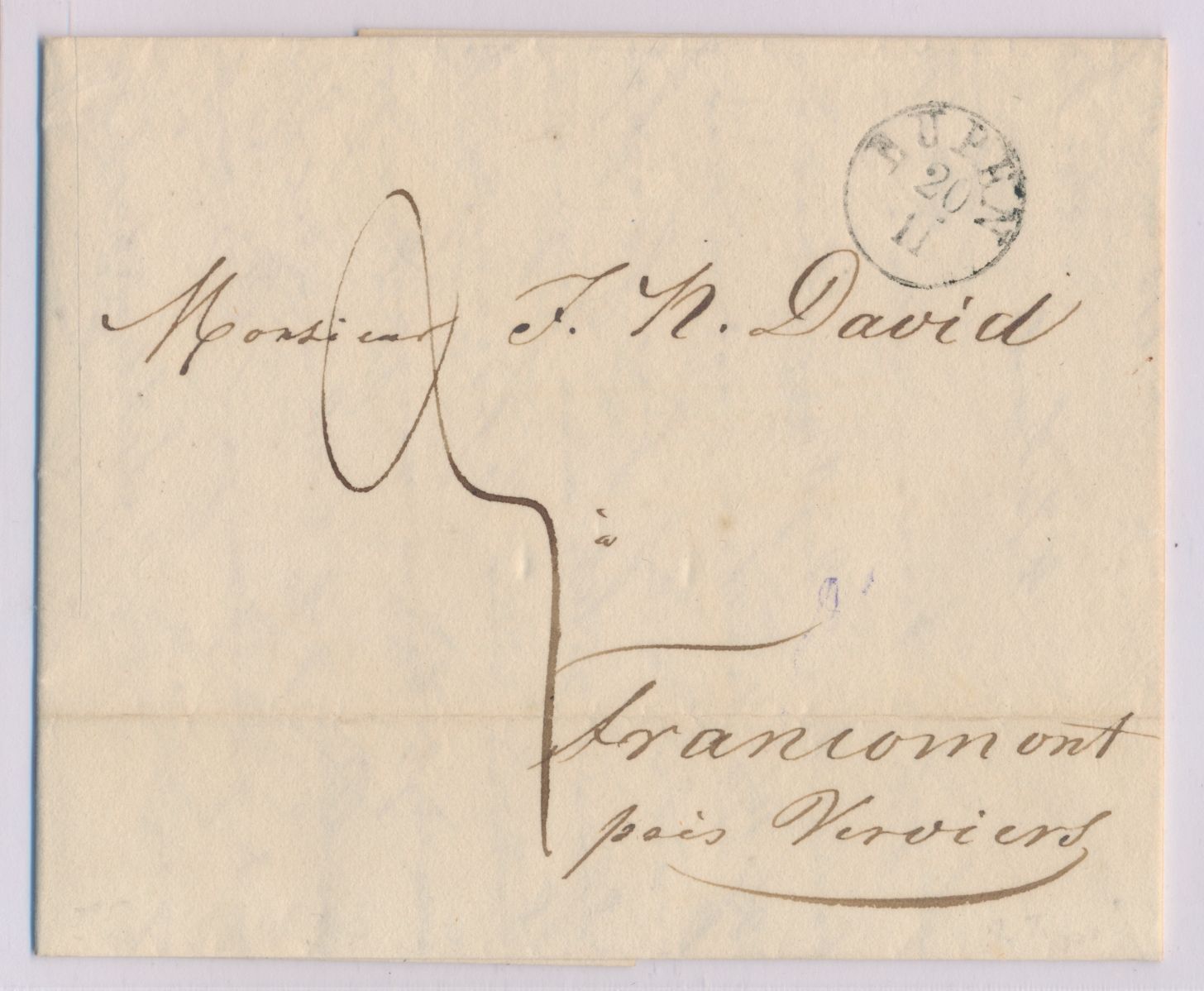kleiner K1 Eupen 20.11.(1835) auf Faltbrief nach Belgien, Ankunftstempel Verviers 20.11., mit komplettem Inhalt