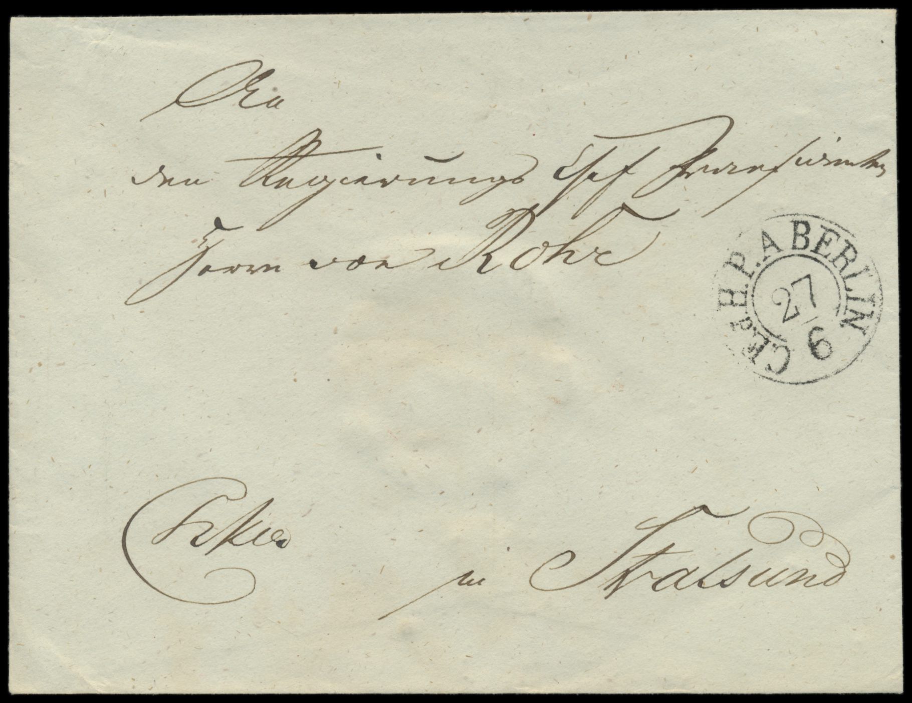Zweikreisstempel des Kabinetts-Postamt C. E. d. H. P. A. Berlin 27.6. auf Umschlag nach Stralsund, rückseitig rotes Lacksiegel, rückseitig Ausgabestempel 1.7.