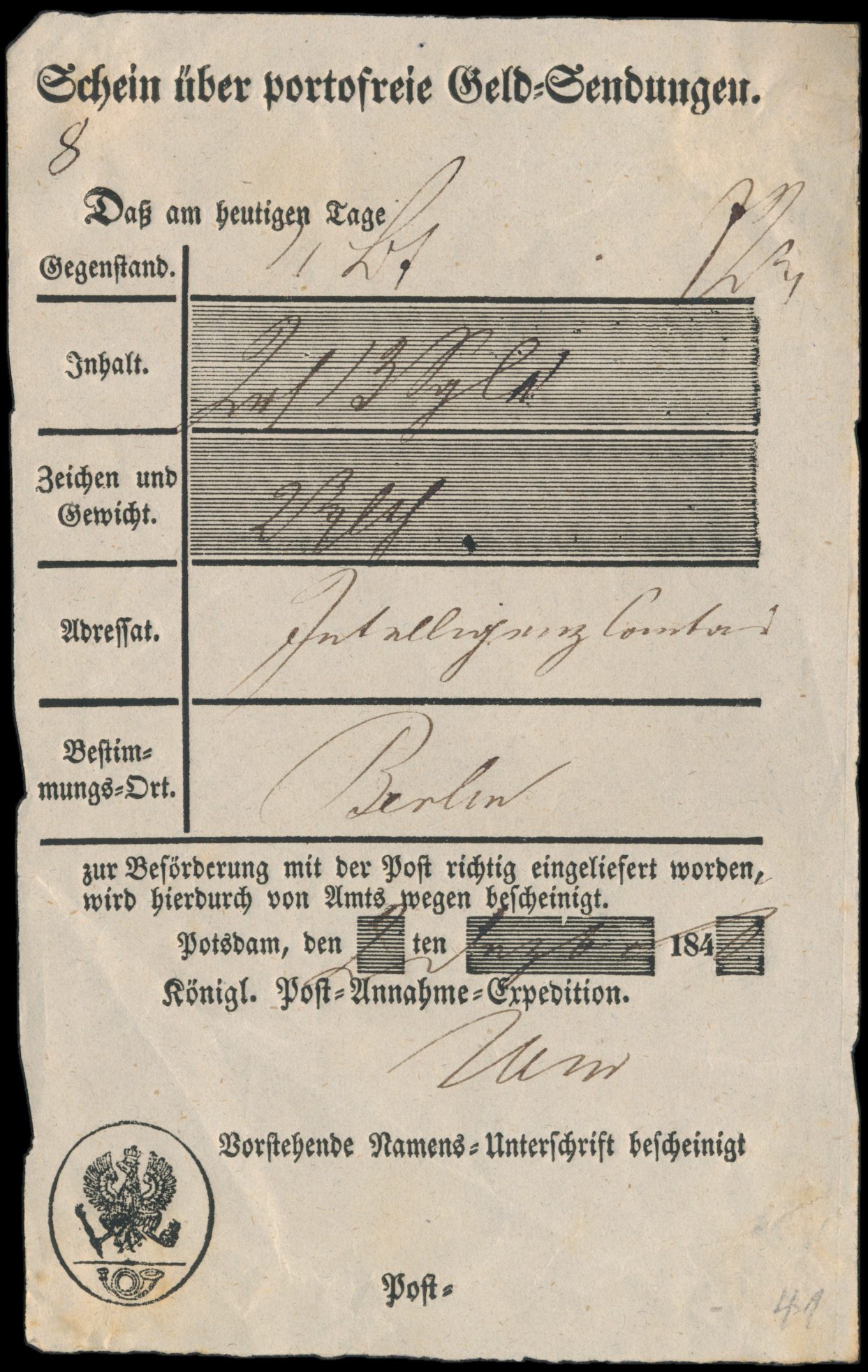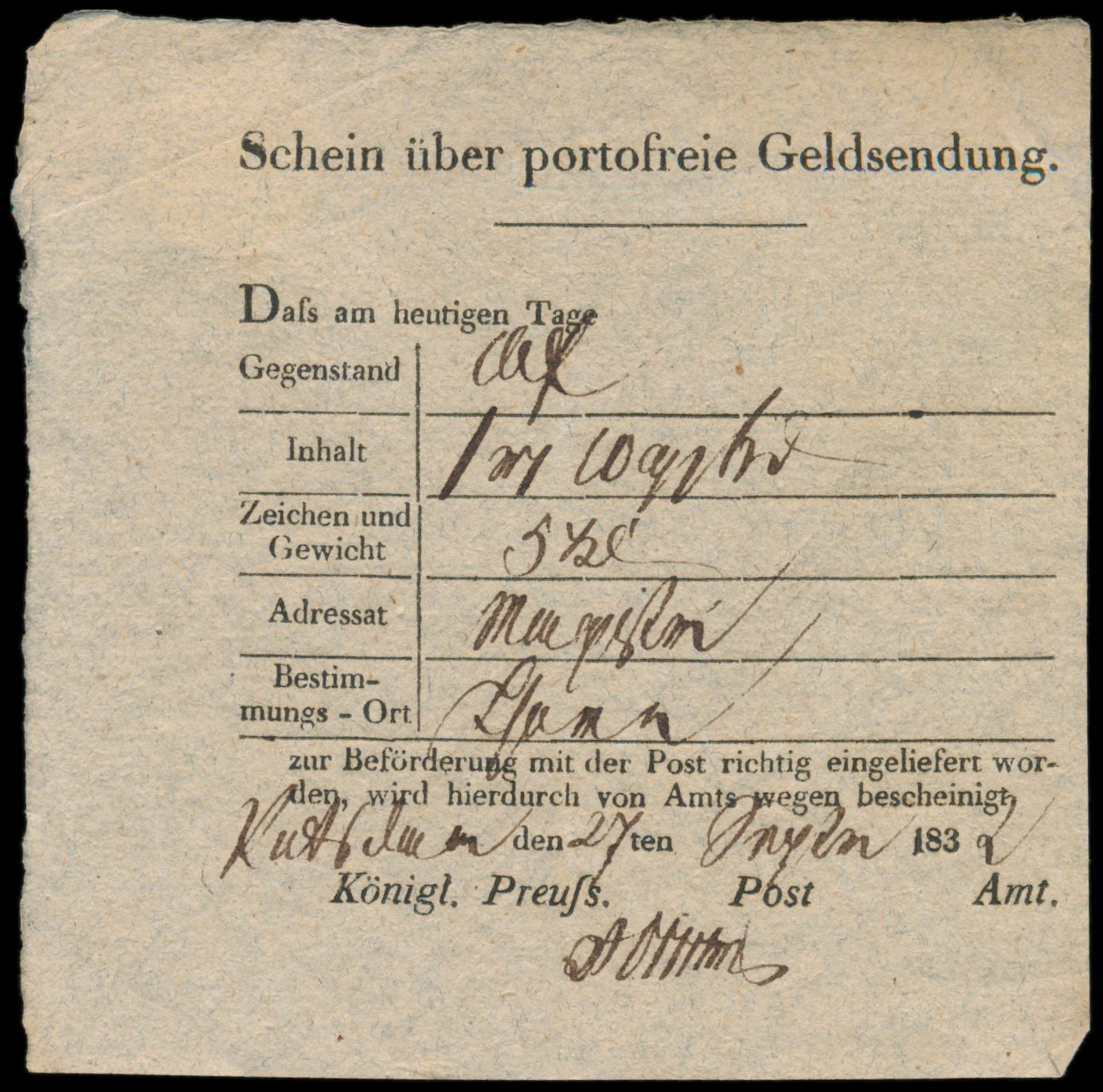 Postschein "Schein über portofreie Geldsendung", handschriftlich "Potsdam, 27.9.1839"