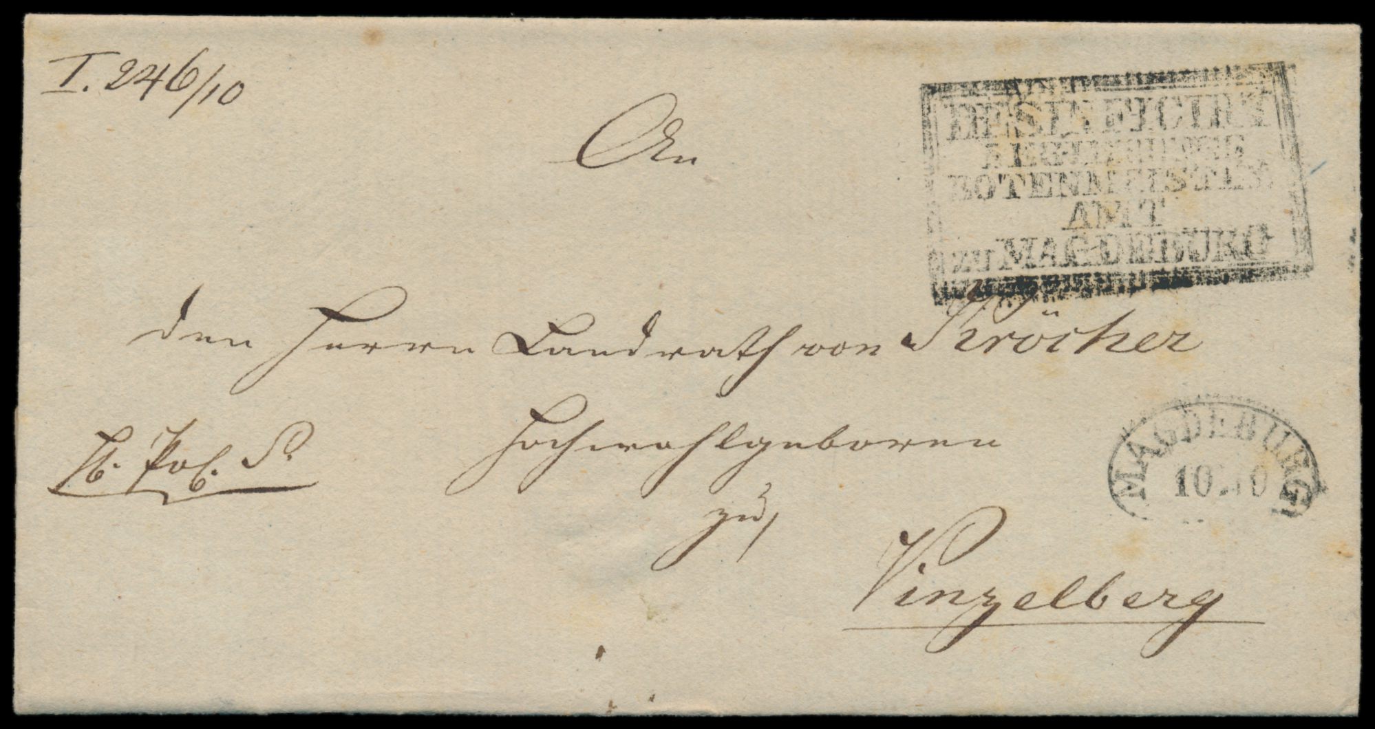 Dienstbriefhülle mit Stempel Magdeburg 10.10.(1831) nach Vinzelburg, seltener Sanitätsstempel R5 Desinficirt / Regierung / Botenmeister / Amt / zu Magdeburg, gering fleckig