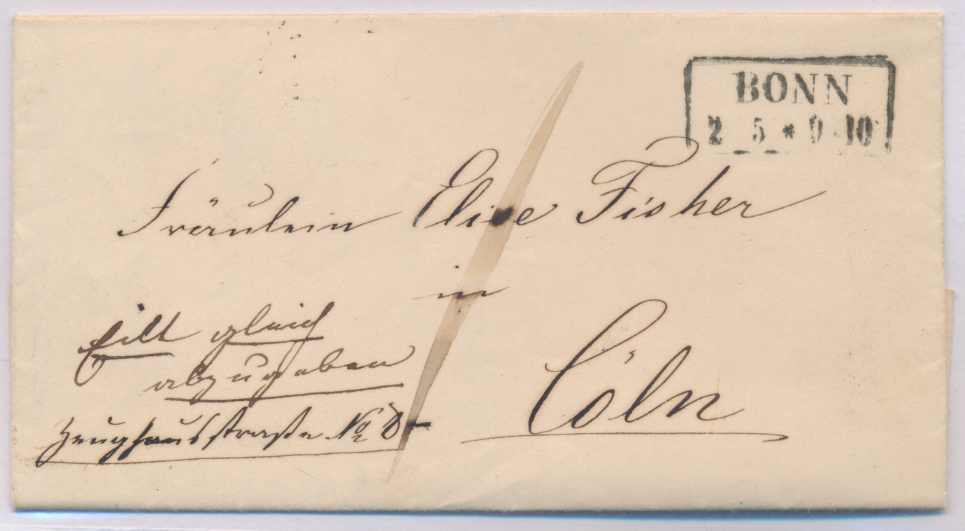 R2 Bonn 2.5. (1851) auf mit komplettem Inhalt nach Köln, handschriftlich: "Eilt, gleich abzugeben", Ankunftsstempel St. P. Coeln 2.5.. Präge-Eindruck Heinr. Wolff Med. Dr. Schreiber ist dessen Tochter Bertha Isabella (später verheiratete Marx),. zum christlichen Glauben konvertiert 1856. Dr. Wolff war ab 1854 ein behandelnder Arzt von Robert Schumann in der Anstalt Endenich.