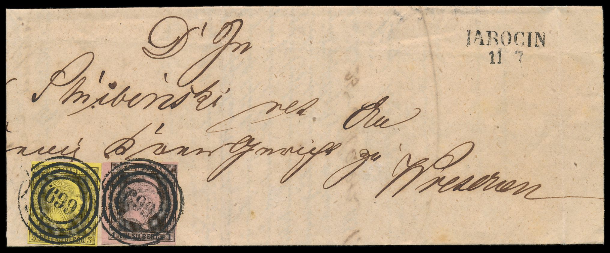 1 Sgr. und 3 Sgr. (beide vollrandig) mit Nummernstempel 669 und L2 Jarocin 11.7.(1851) auf Post-Insinuations-Dokument nach Wreschen, senkrechte Büge außerhalb der Frankatur