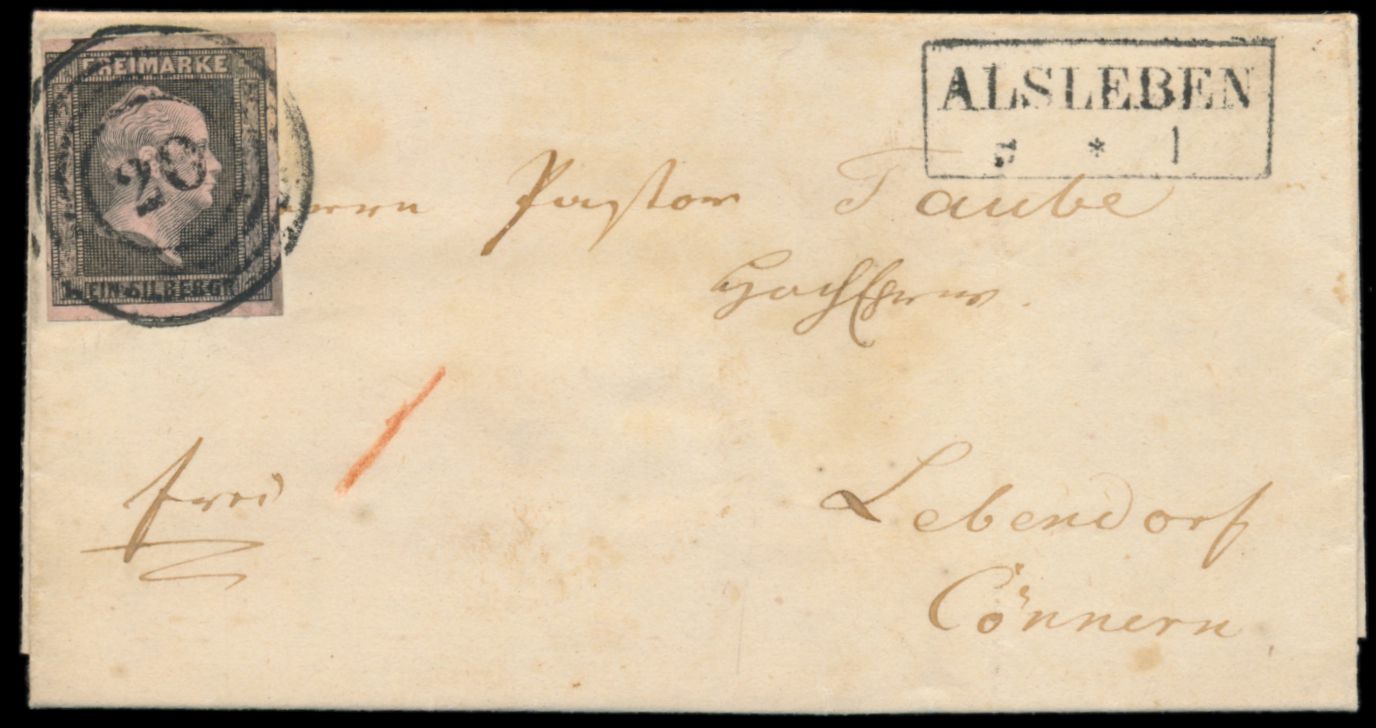 1 Sgr (vollrandig) auf Faltbrief mit Nummernstempel 20 und R2 Alsleben 9.9.(1851), nach Lobendorf bei Cönnern, mit komplettem Inhalt, schwach fleckig