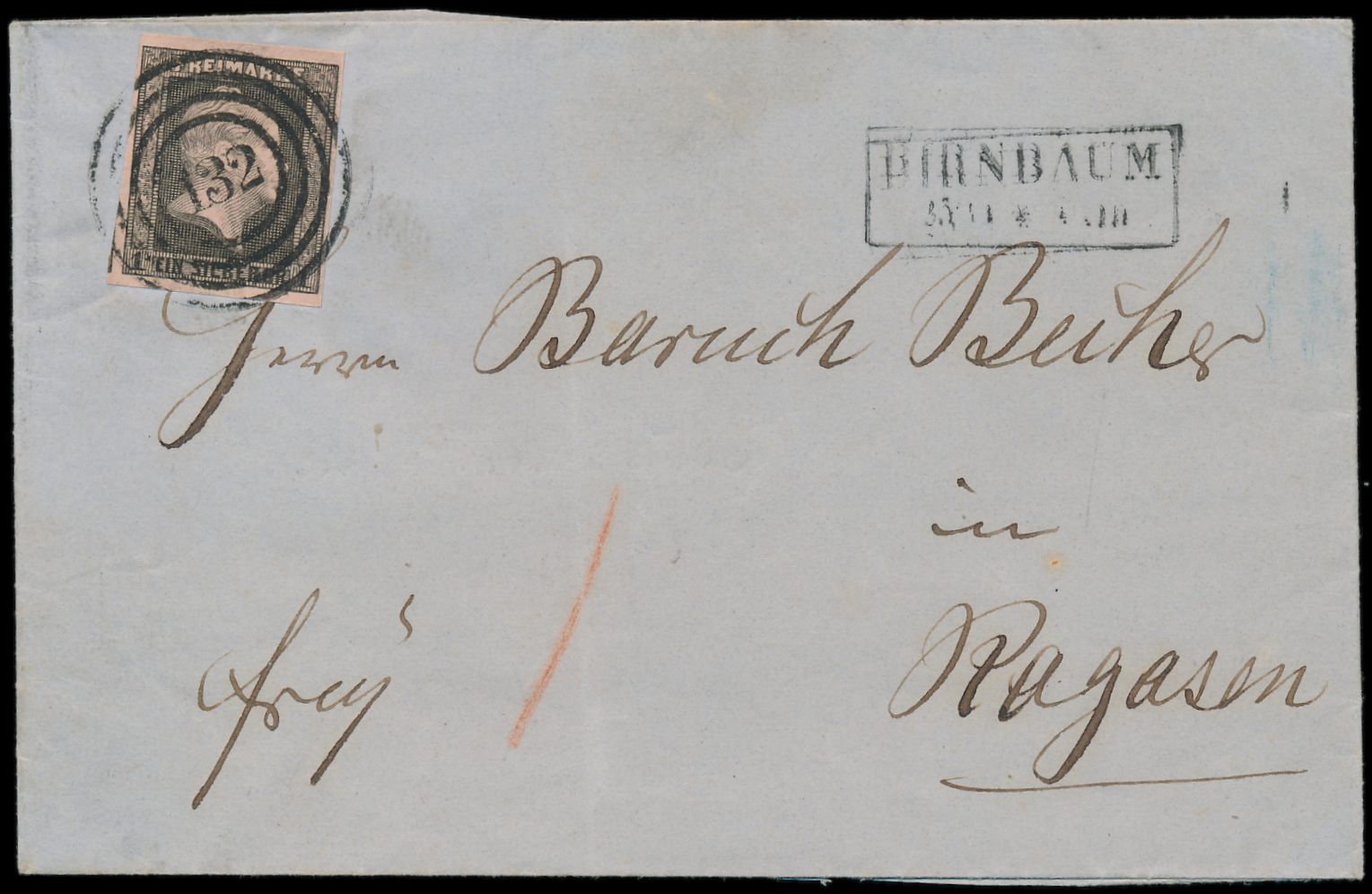 1 Sgr. mit Nummernstempel 132 und R2 Birnbaum 25.11. auf Faltbriefhülle nach Rogasen, Ankunftstempel 27.11.
