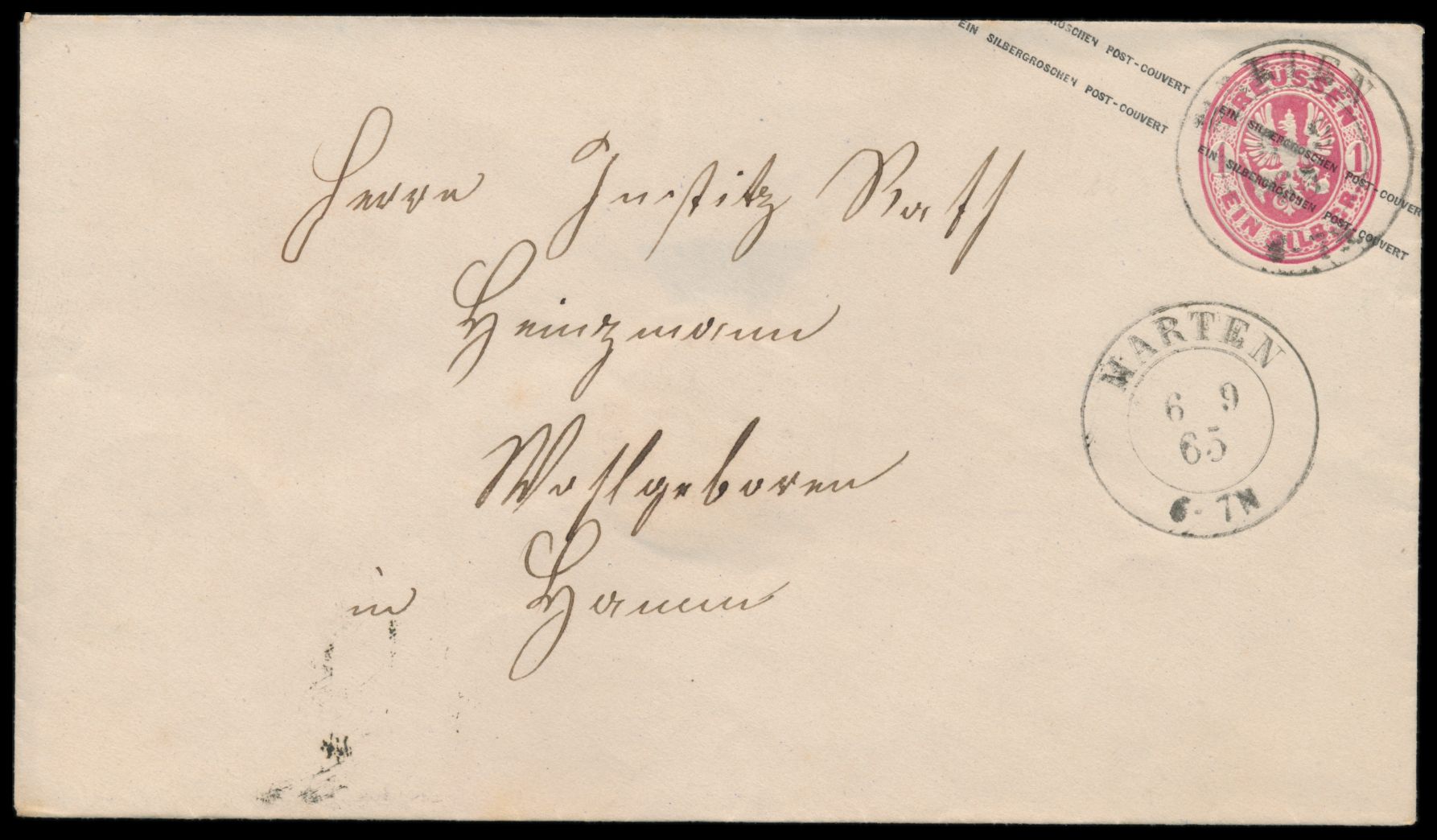 Ganzsache 1 Sgr mit seltenem K2 Marten 6.9.65 nach Hamm, Ankunftstempel 7.9.