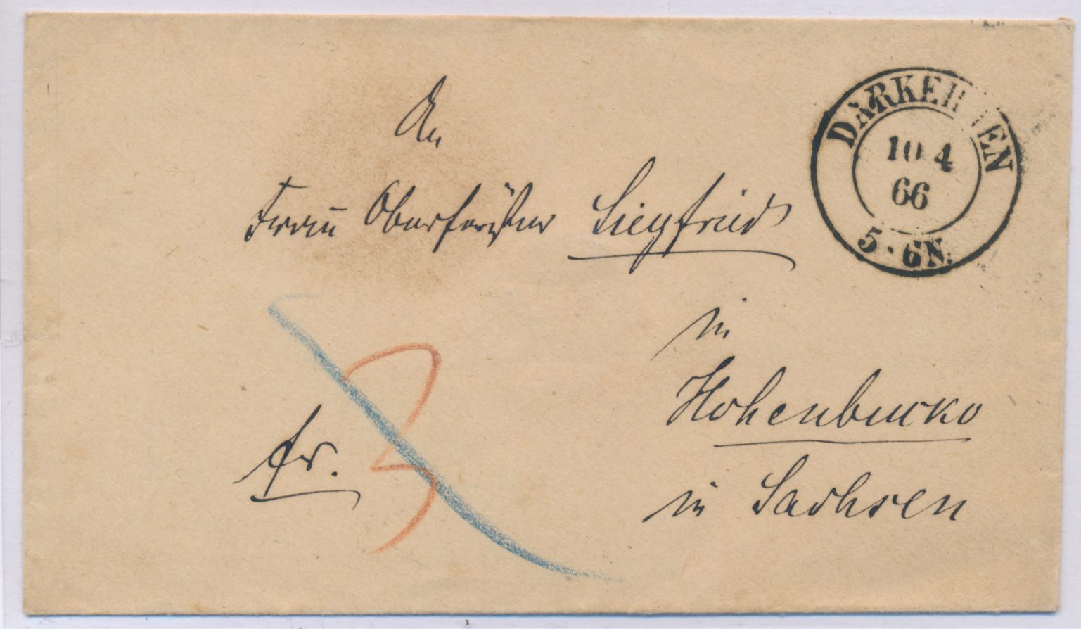 K2 Darkehmen 10.4.66 auf barfrankiertem Brief (Umschlag) nach Hohenbuckow, Ausg.-Stempel 13.4.
