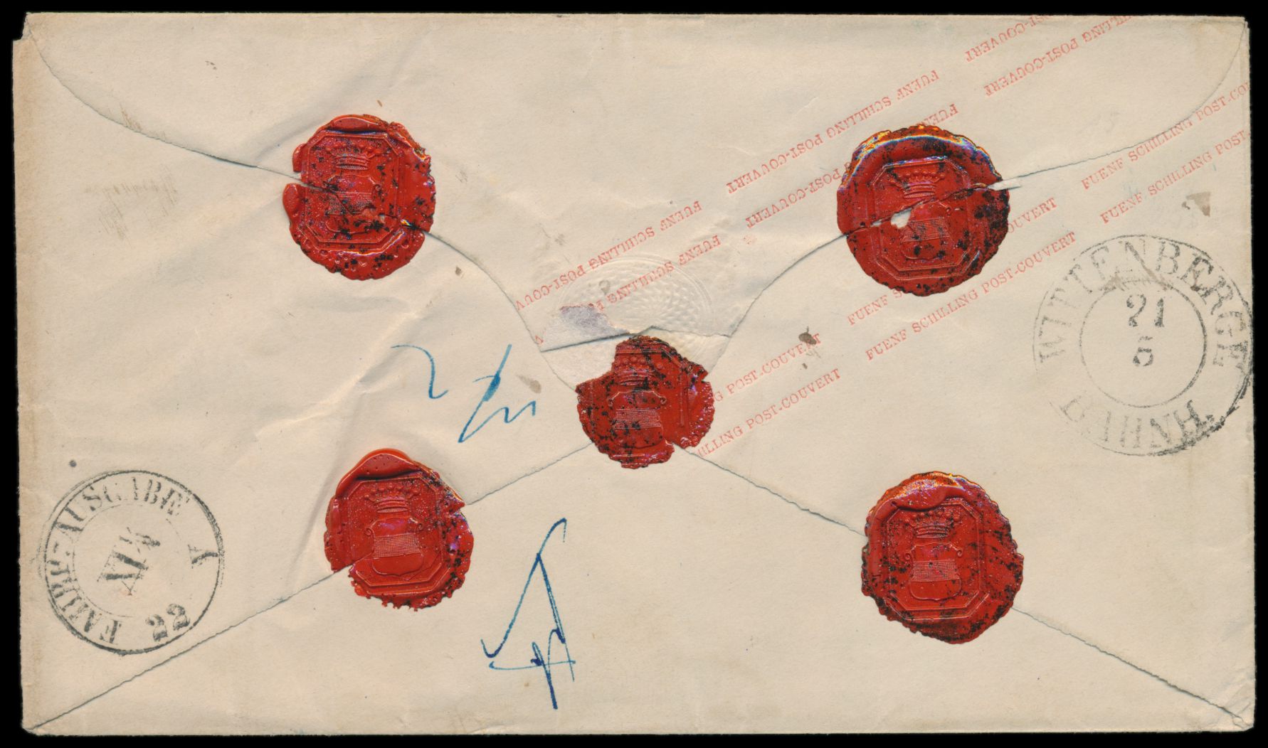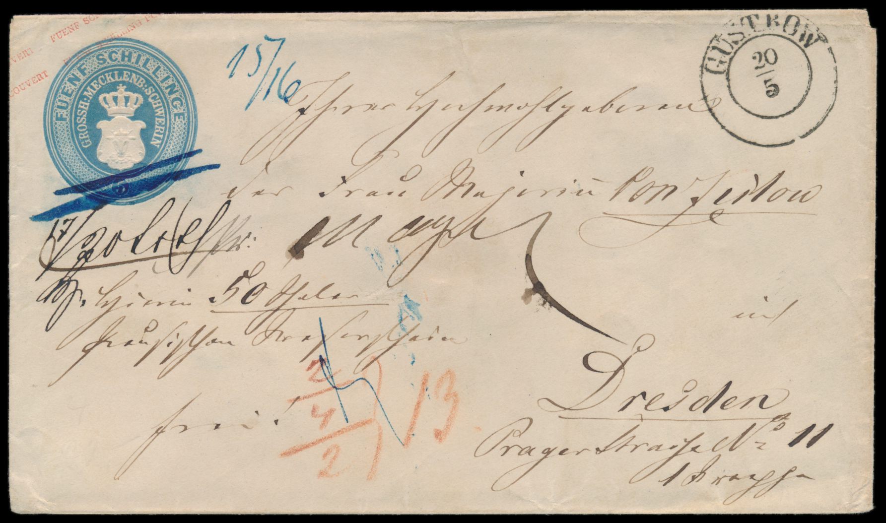 Ganzsachenumschlag 5 Sgr als Geldbrief nach Dresden, Inhaltsangabe "Hierin 50 Thaler Preußischer Kassenschein", Stempel Güstrow 20.5., Durchgangsstempel Wittenberge Bahnh. 21.5. und sächsischer Ankunftstempel Fahrp.-Ausgabe 22.5.