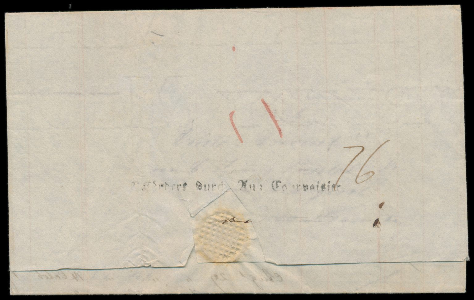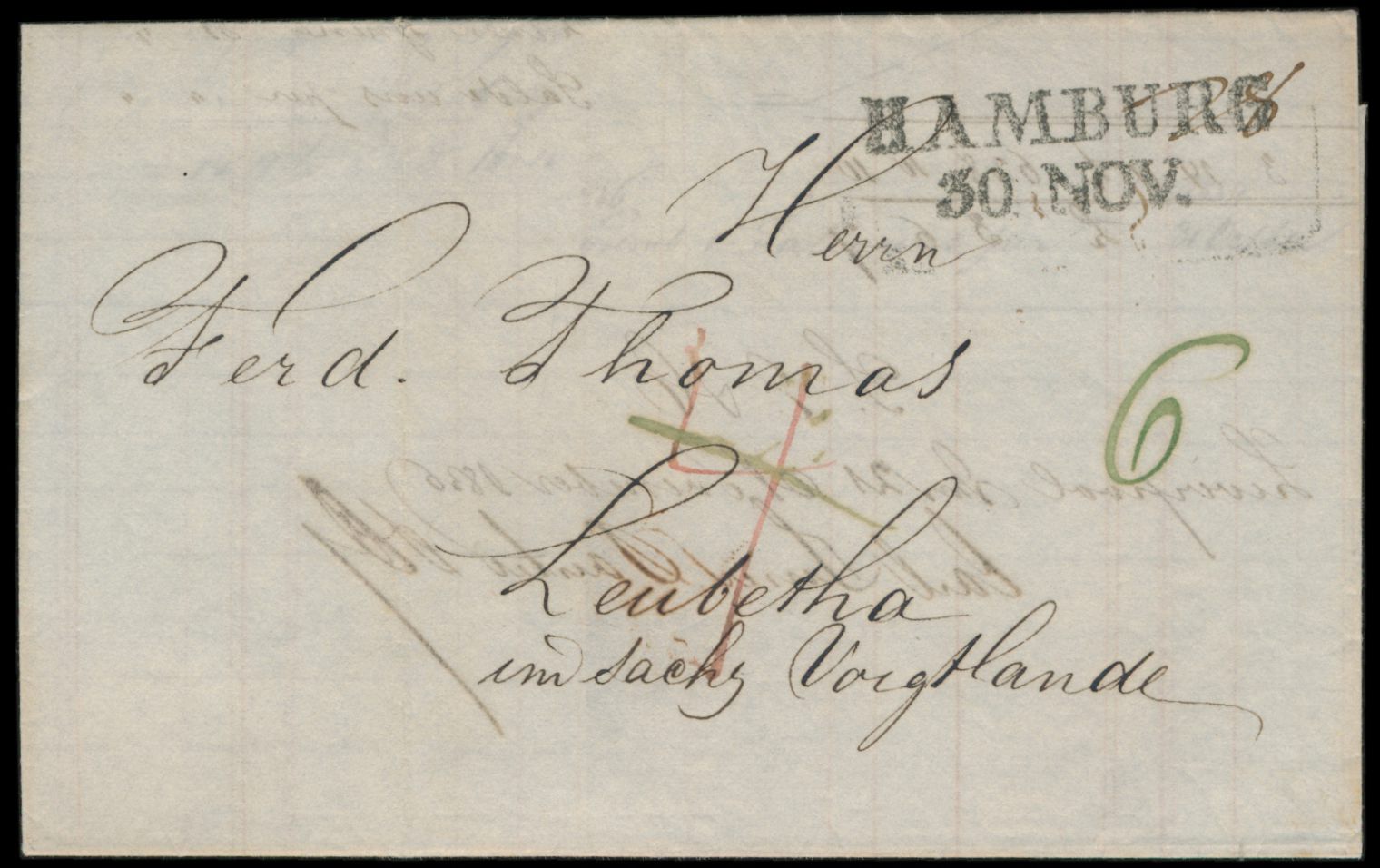 Faltbrief aus Liverpool vom 21.11.1836 nach Leubetha in Sachsen, rückseitig L1 "Befördert durch Aug. Courvoisier" und Aufgabestempel Hamburg 30. Nov. , handschriftliche Portovermerke, mit Inhalt