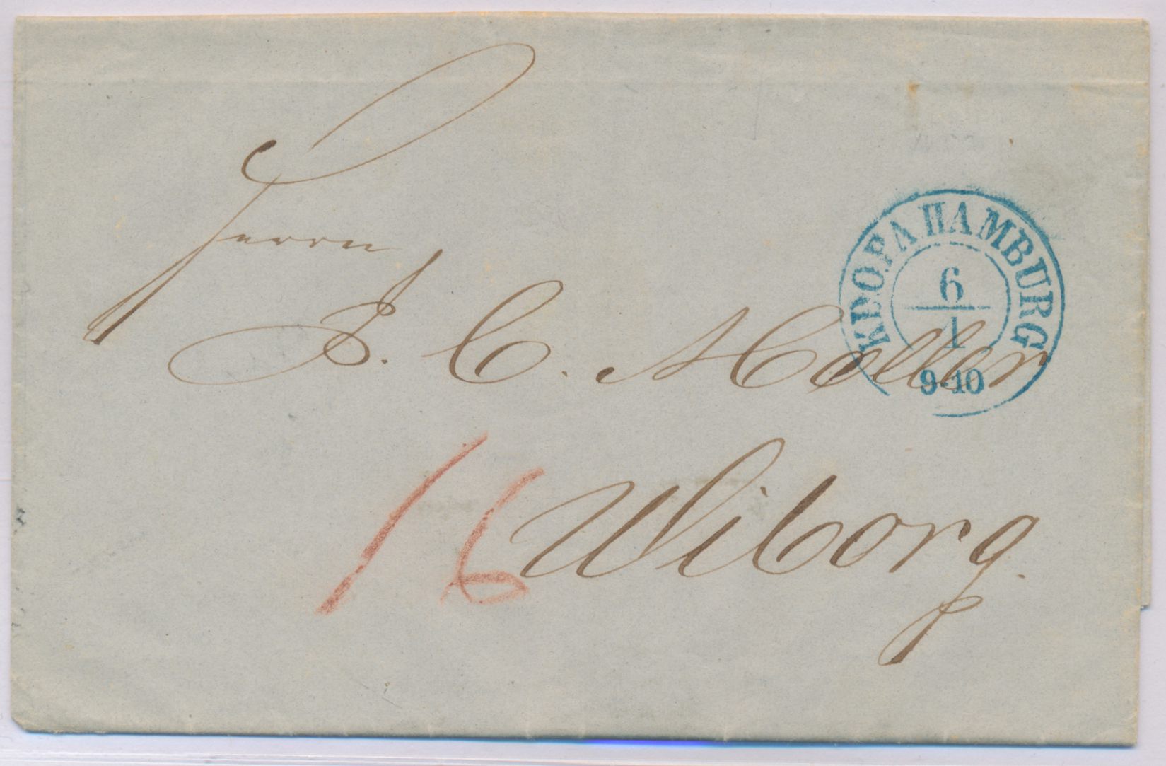 Dänisch. O.P.A.: blauer K2 K.D.O.P.A. Hamburg 6.1.(1852) auf Faltbrief nach Wiborg / Finnland, rote Portoziffer "16", mit komplettem Inhalt