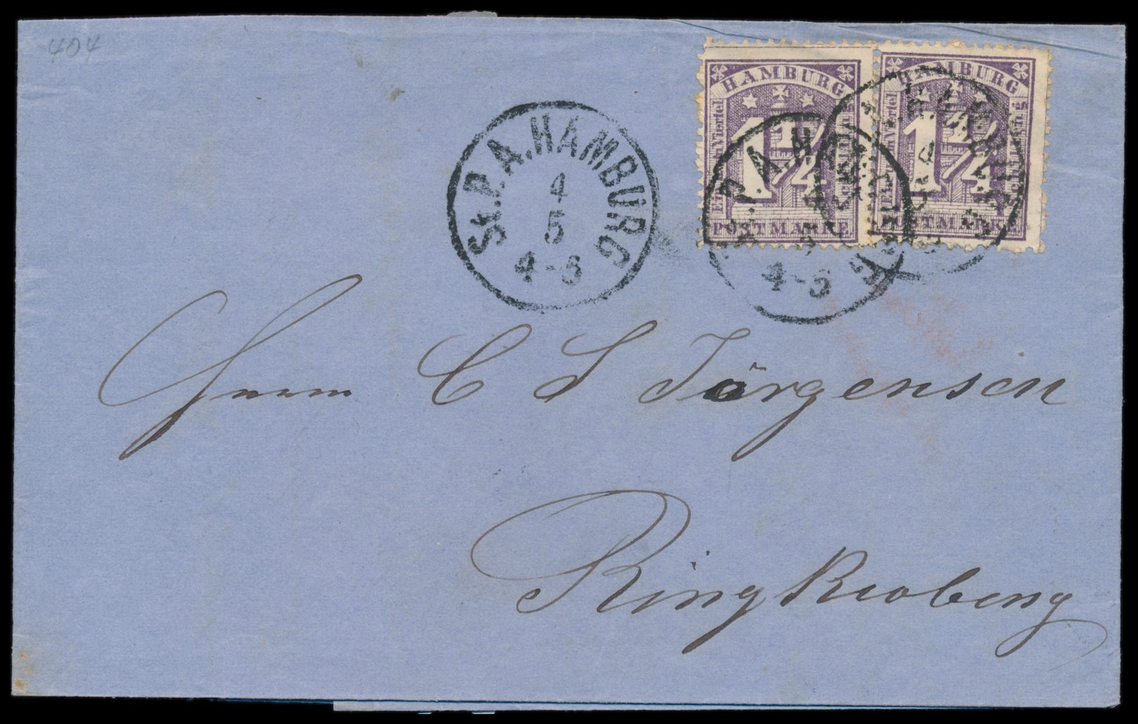 2 x 1 1/4 S. dunkelviolett auf Faltbrief nach Ringkjöbing / Dänemark, Stempel St. P. A. Hamburg 4.5.(1865), rückseitig Briefkastenstempel "5. St. P. A. 4.5.", mit Teil des Inhalts