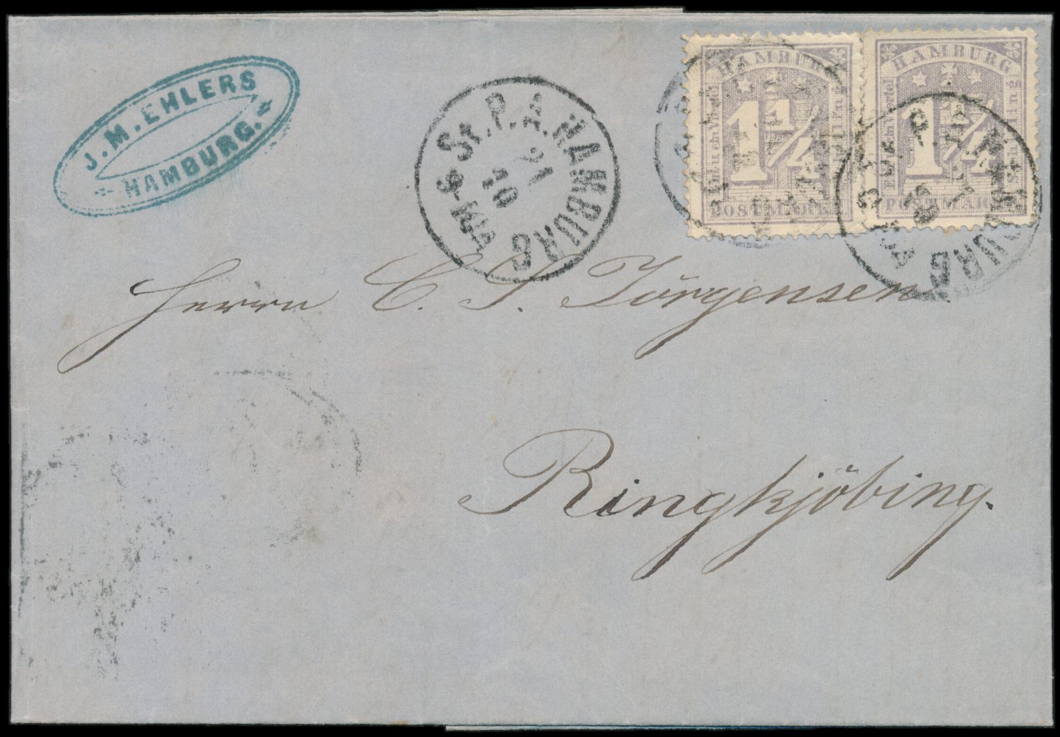 2 x 1 1/4 S. dunkelgraupurpur auf Faltbrief nach Dänemark, Stempel St. P. A. Hamburg 21.10.(1865), rückseitig Briefkastenstempel "7. St. P. A. 21.10.", Durchgangsstempel Kolding 22.10. Ankunftstempel Ringkjöbing 23.10., mit Inhalt