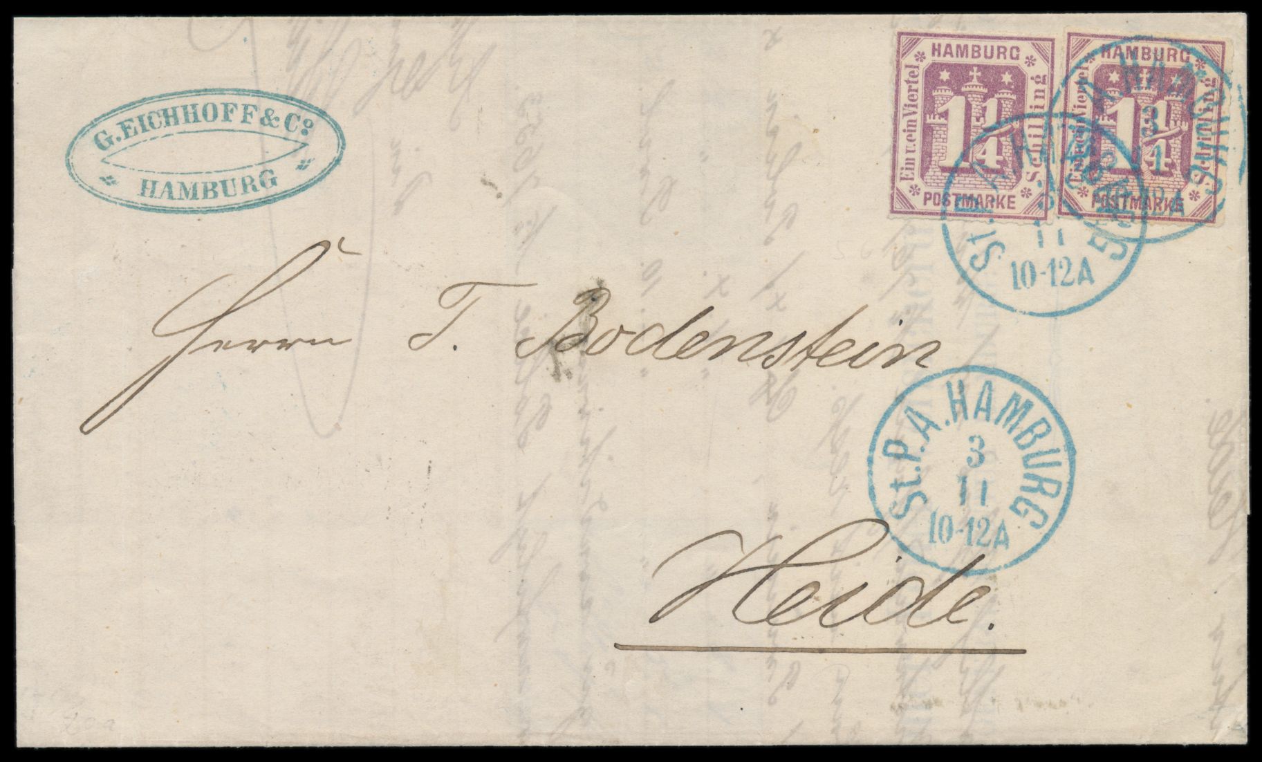 2 x 1 1/4 S. durchstochen (1866) auf Faltbrief mit hellblauem Stempel St.P.A. Hamburg 3.11.(1866) nach Heide, rückseitig Briefkastenstempel "7 St.P.A. 3.11.", Ankunftstempel Heide 4.11., mit komplettem Inhalt