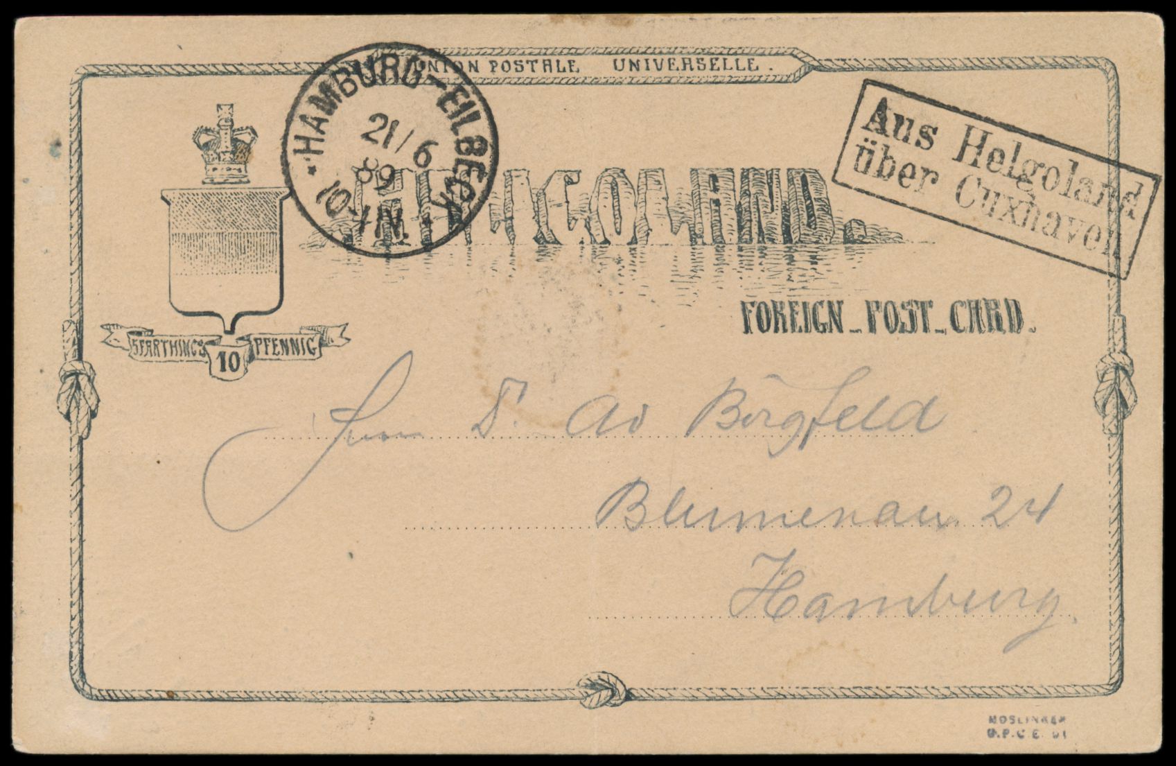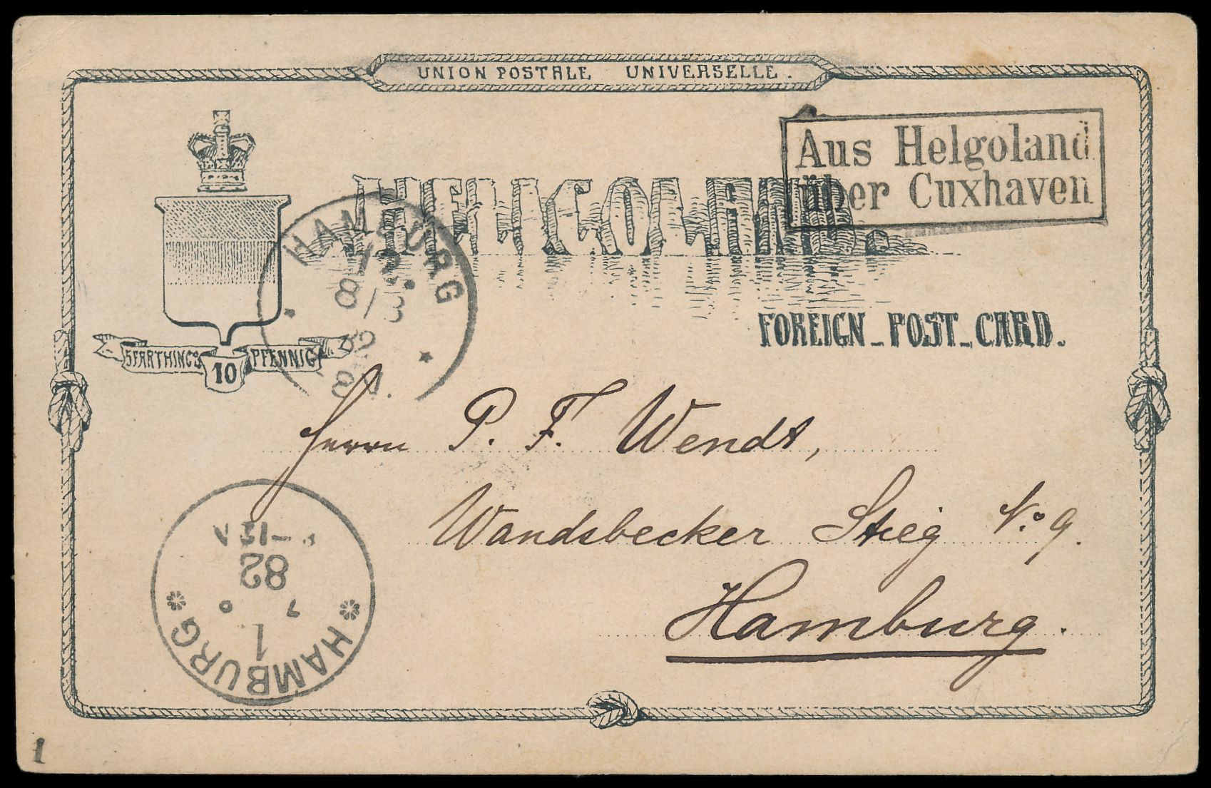 Helgoland-Ganzsache nach Hamburg, geschrieben auf Helgoland am 7.8.1882, R2 Aus Helgoland über Cuxhaven, Haller-Ankunft-Maschinenstempel von Hamburg 1 7.8.82 (Miller Typ a) und Stempel Hamburg 12 8.8.82, Bedarf