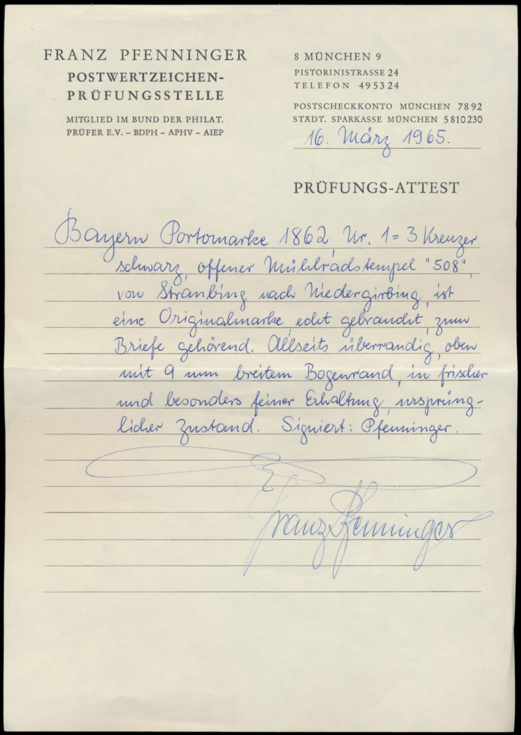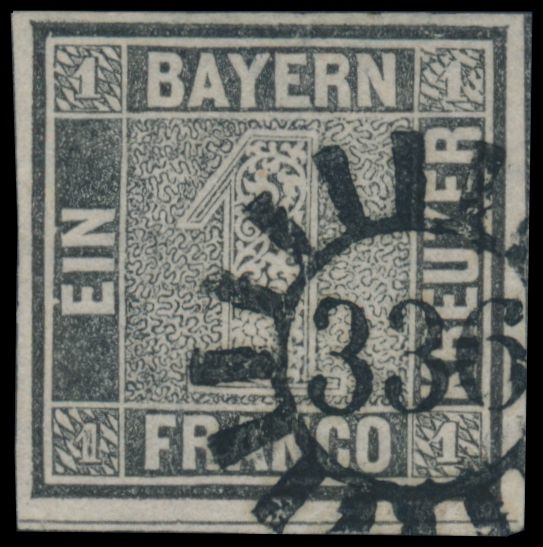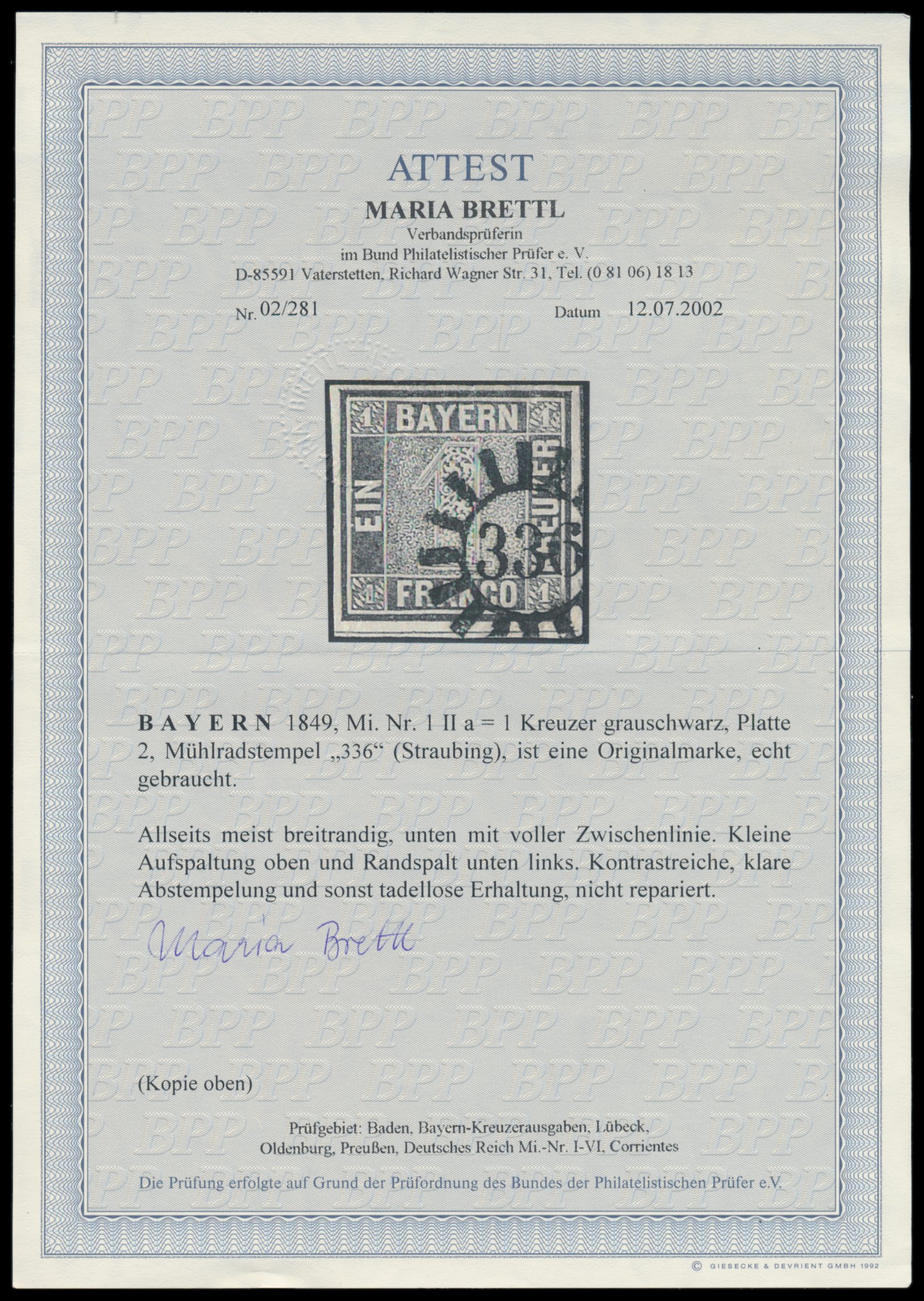1 Kreuzer grauschwarz, Platte 2, Mühlradstempel 336 (Straubing), allseits breitrandig, unten mit voller Zwischenlinie, Fotoattest Maria Brettl BPP (2002): "... kleine Aufspaltung oben und Randspalt unten links ... sonst tadellose Erhaltung, nicht repariert.", MiPr. 3500