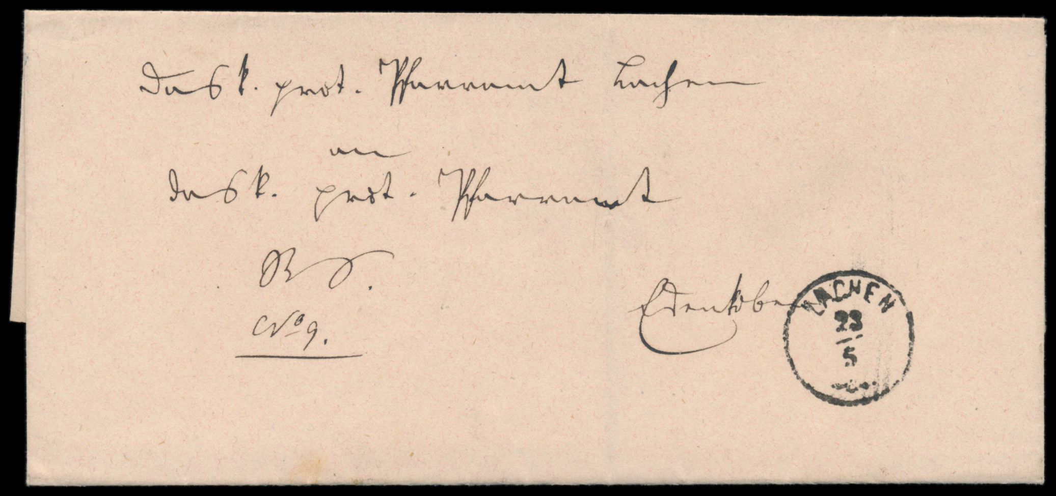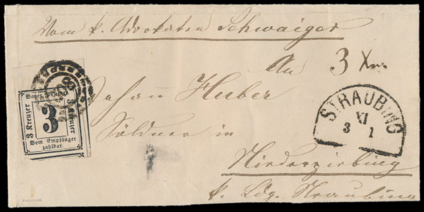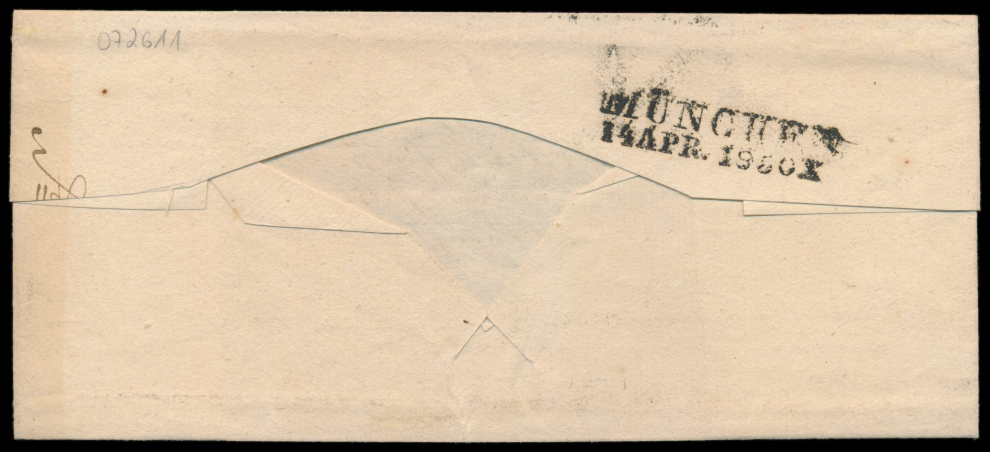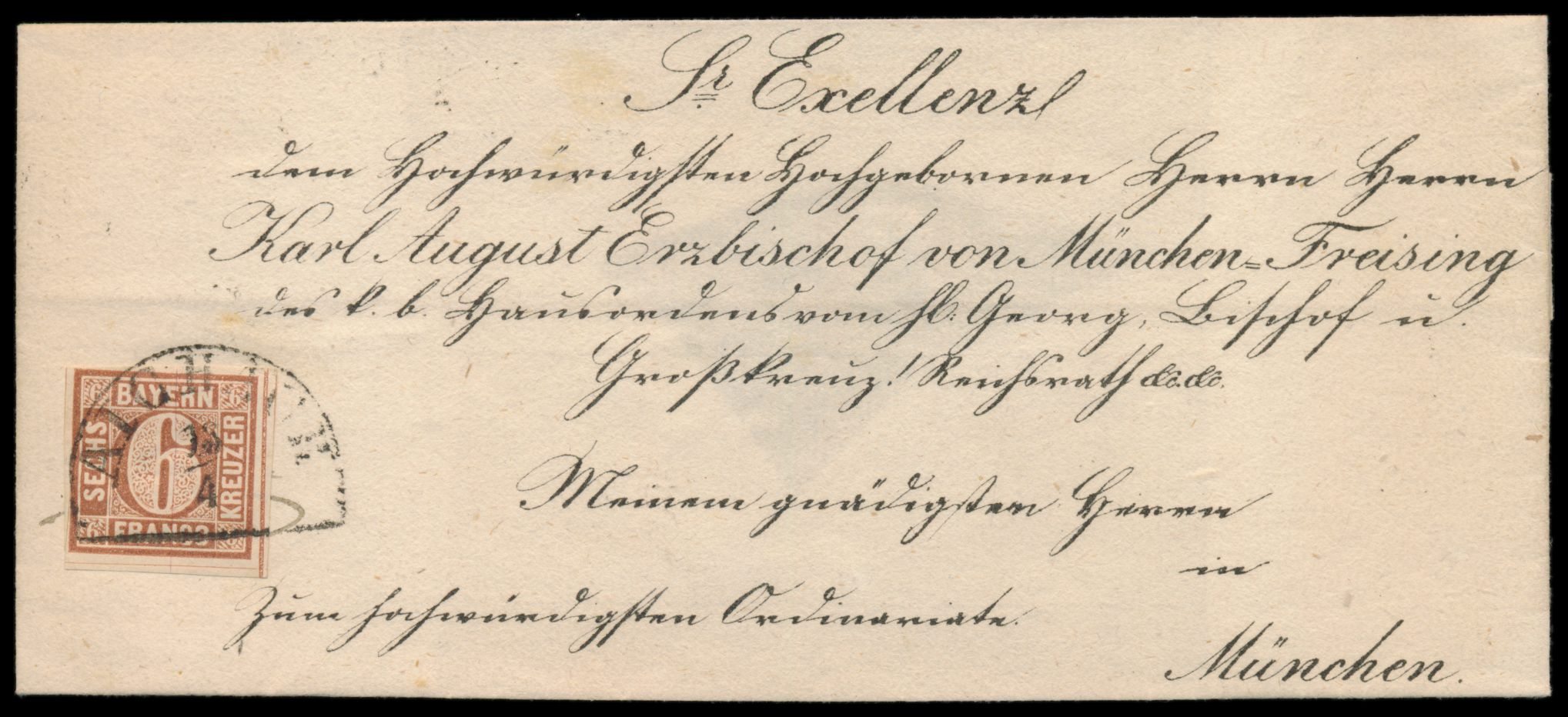 6 Kreuzer Type I (voll- bis breitrandig) mit Halbkreisstempel Aichach 13.4.(1850) an den Erzbischof von München-Freising in München, Ankunftstempel München 14. Apr. 1850