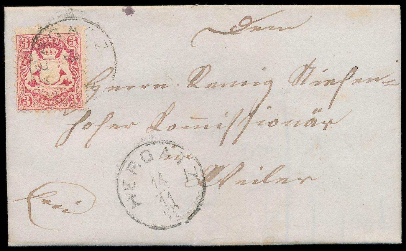 3 Kr. auf Faltbrief mit seltenem Einkreisstempel Hergatz 14.11.72 (mit Jahreszahl), Sem Nr. 12a, nach Weiler, Ankunftstempel 15.11., mit Inhalt