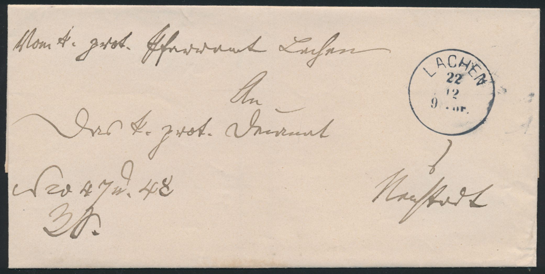 Dienst-Briefhülle mit seltenem kleinem K1 Lachen 23.5. mit Zierstück unten, Rückseite Ankunftsstempel Halbkreisstempel Edenkoben 23.5., dazu Briefhülle mit Folgestempel Lachen 22.12., als Kreuzerstempel sehr selten