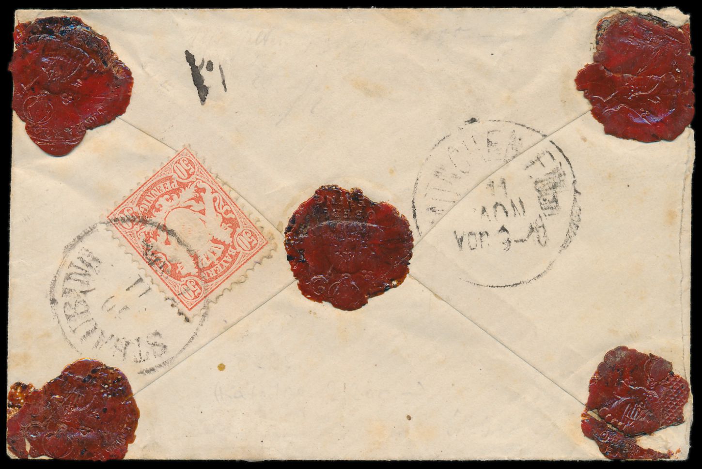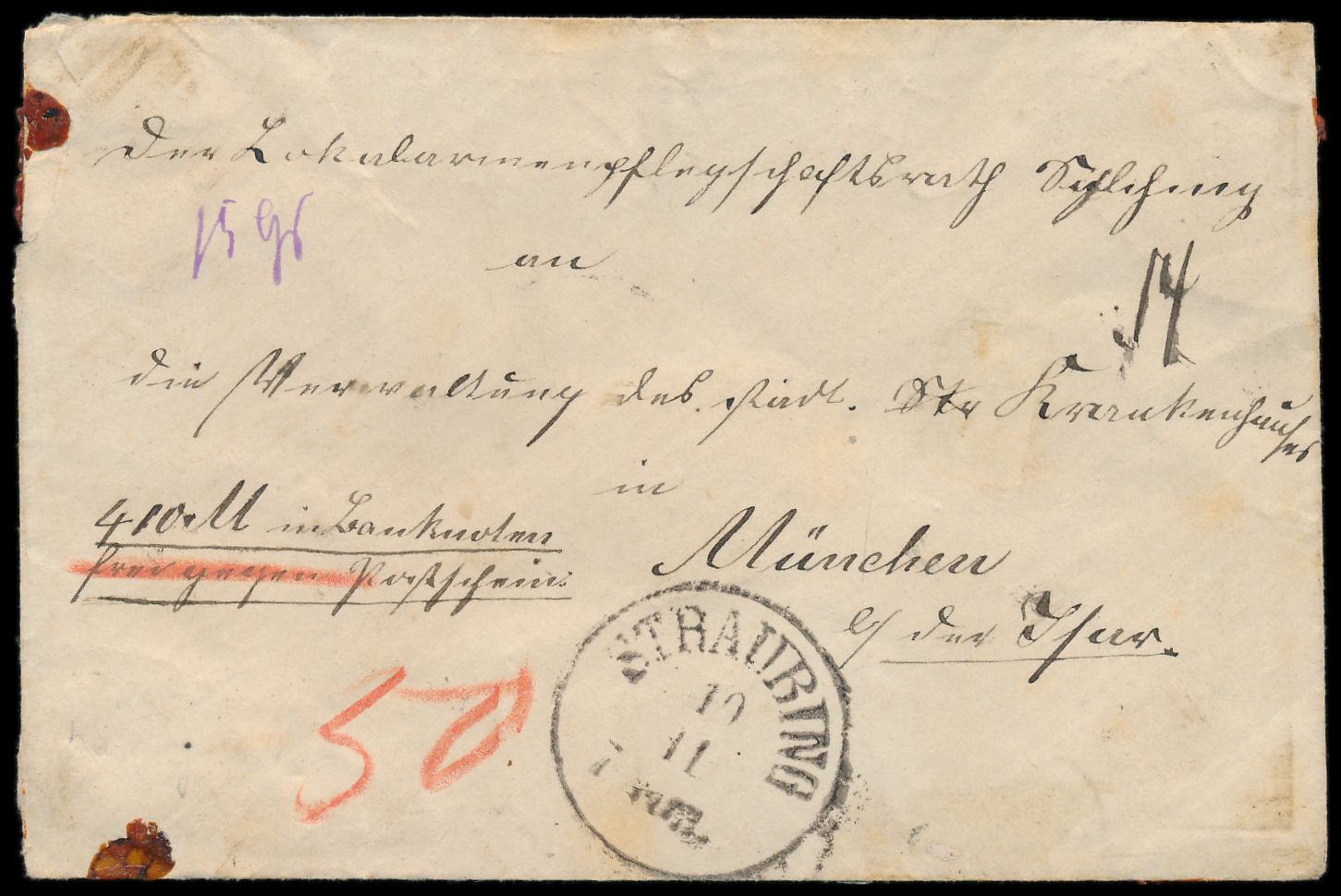 Einzelfrankatur 50 Pf. zinnoberrot (Ausgabe 1876) rückseitig auf kleinformatigem gesiegeltem Wertbrief nach München, Stempel Straubing 10.11., Ankunftstempel 11.11., MiPr. 2200