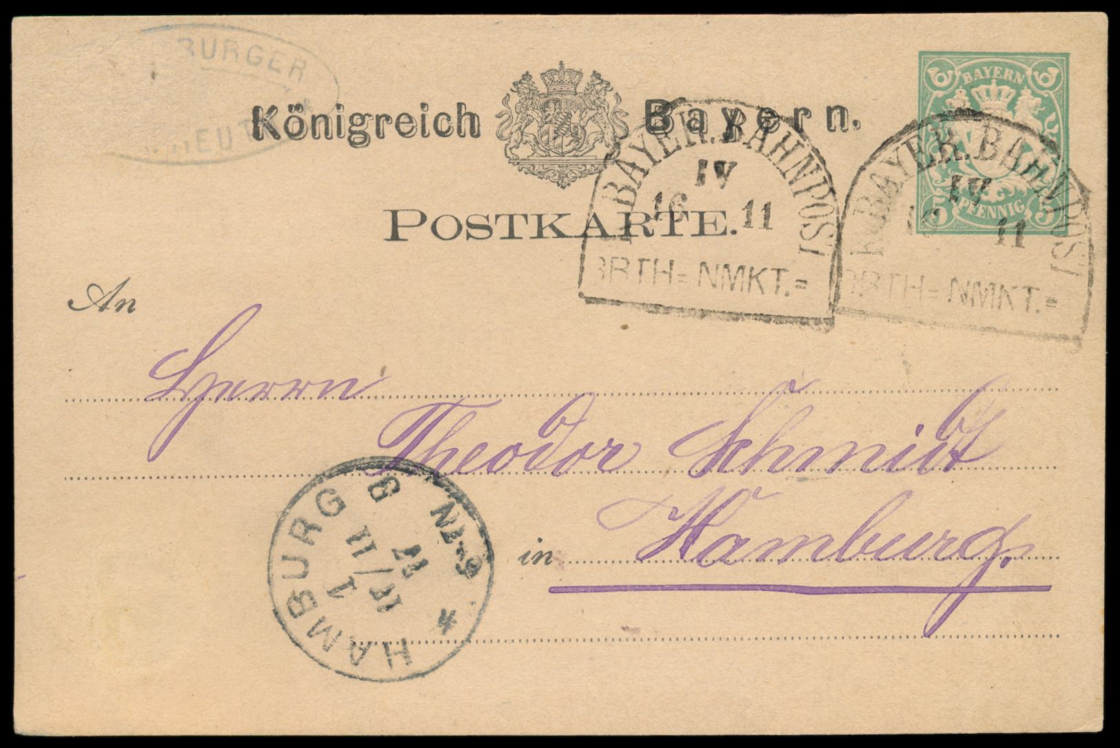 zwei Ganzsachen mit Halbkreisstempel K. Bayer. Bahnpost Brth-Nmkt. 16.11.77 (Kurs IV) und 8.3.81 (Kurs II), Strecke Bayreuth - Neuenmarkt, nach Hamburg bzw. Leipzig, Bedarf