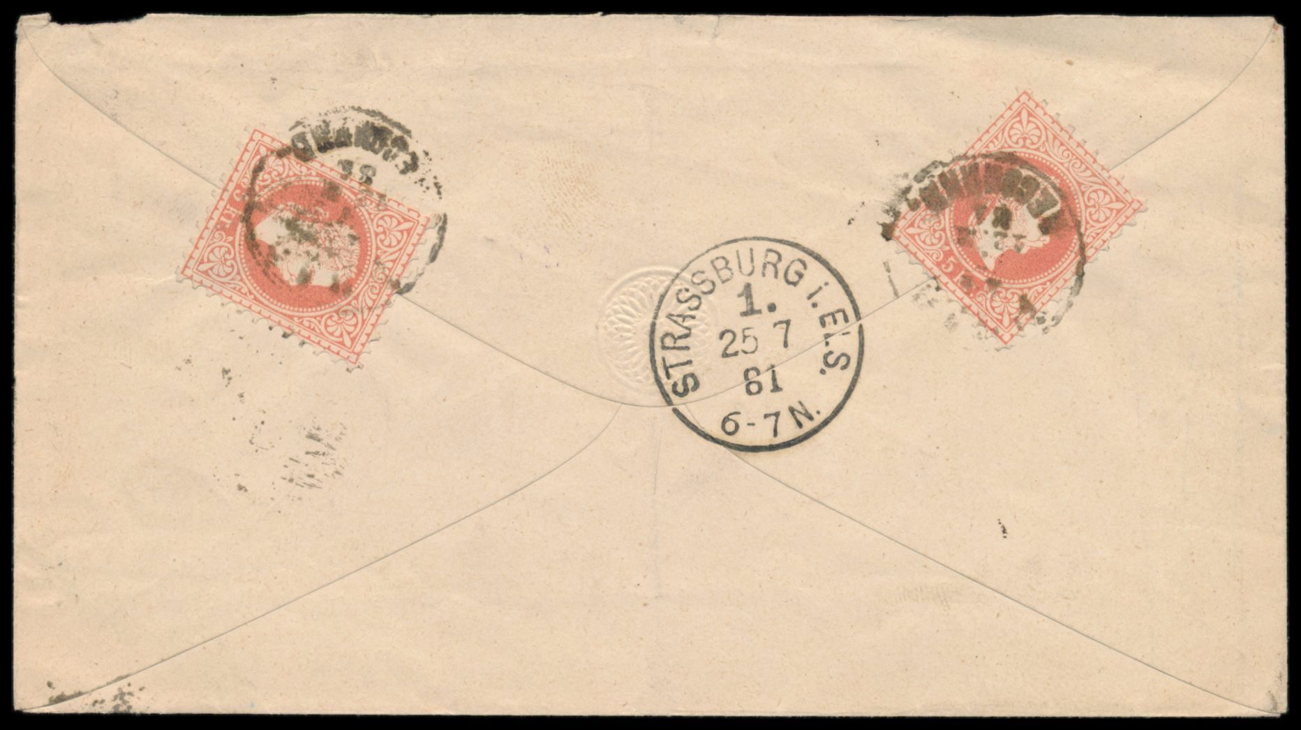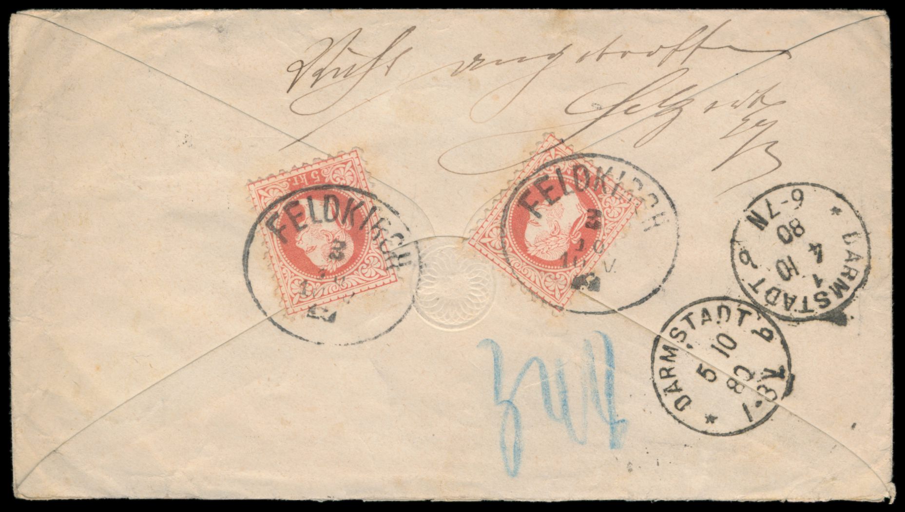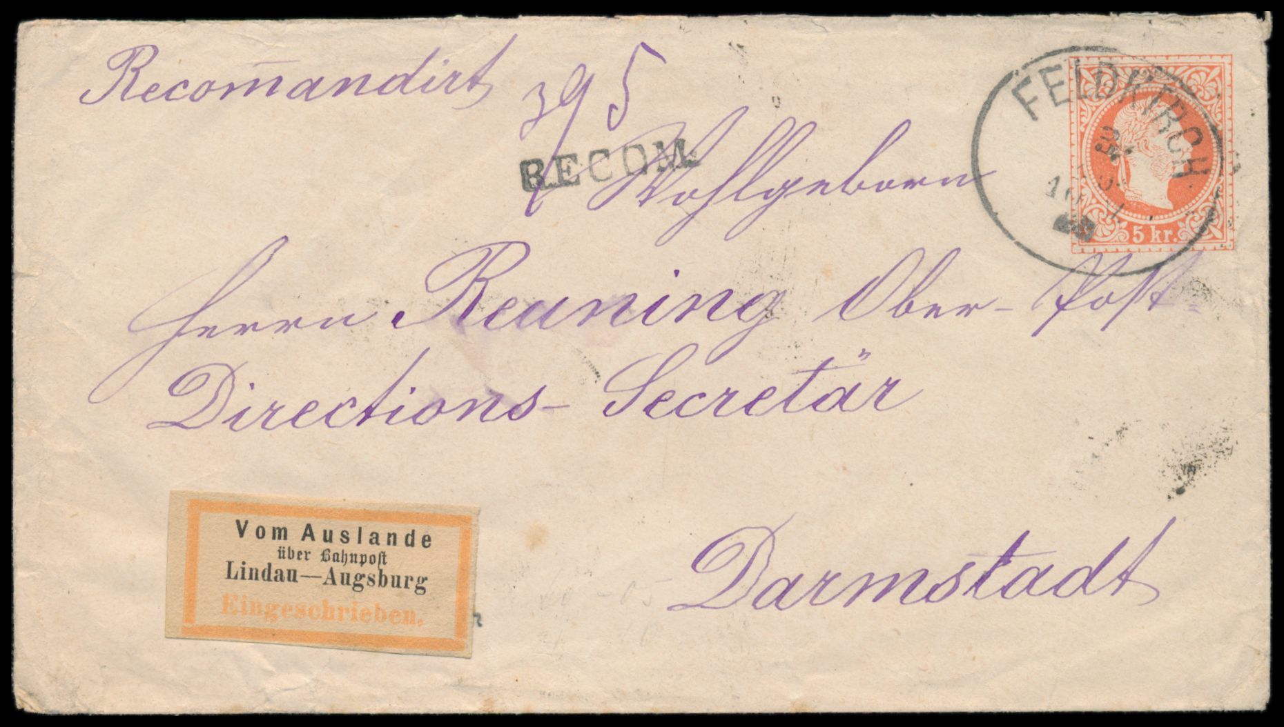Österreich, Ausgabe 1867: Ganzsachenumschlag 5 Kr. mit rückseitig 2 x 5 Kr., Stempel Feldkirch 3.10.1880, Stempel Recom., nach Darmstadt, R-Zettel "Vom Auslande über Bahnpost Lindau - Augsburg" , Ankunftstempel 4.10.80
