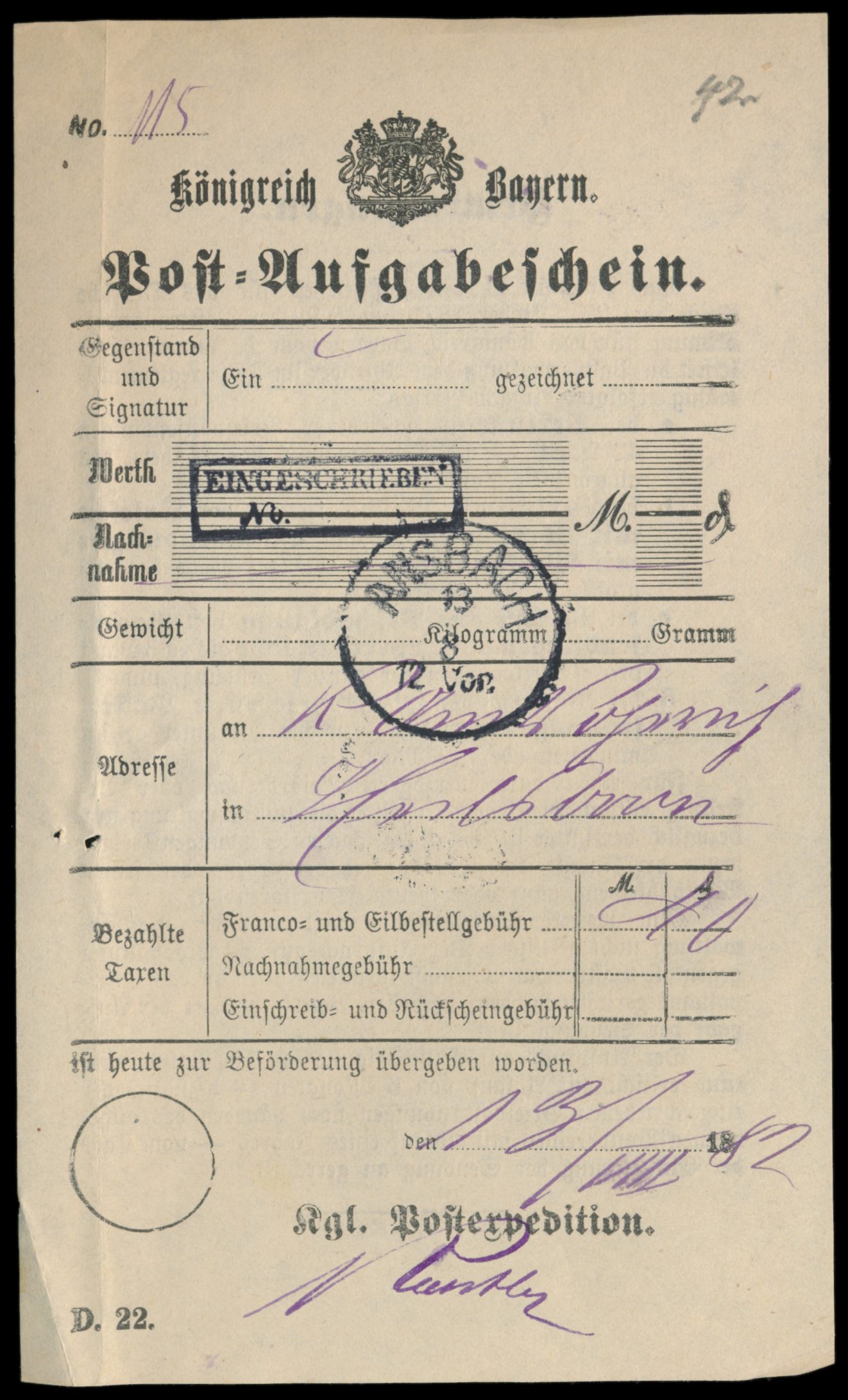 "Post-Aufgabeschein" mit schwarzen R2 "Eingeschrieben No. ..." und Stempel Ansbach 13.8.(1882)