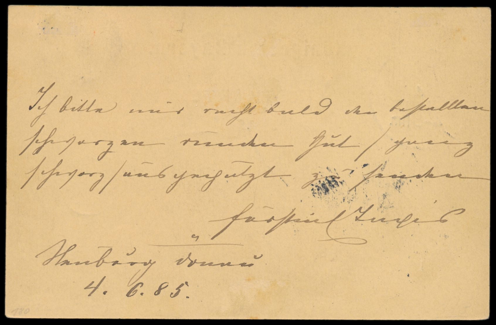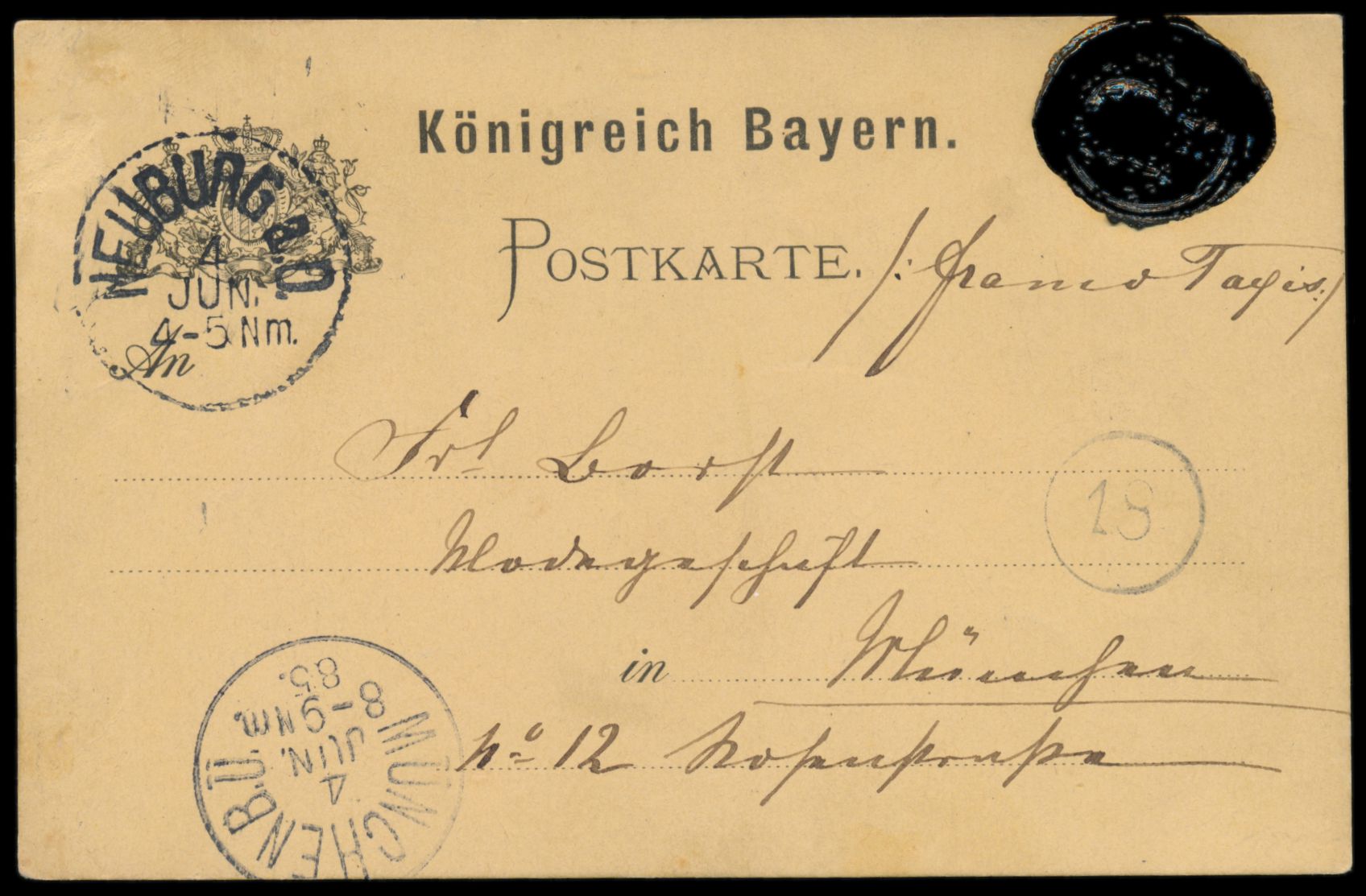 Postkarte "Königreich Bayern" mit schwarzem Trauer-Lacksiegel und handschriftlichem Vermerk "franco Taxis" rechts oben, Stempel Neuburg a. D. 4.6.(1885), nach München, Ankunftstempel 4.6.85, Text "Ich bitte mit recht bald den bestellten schwarzen runden Hut (ganz schwarz) ausgeputzt zu senden. Fürstin Taxis"