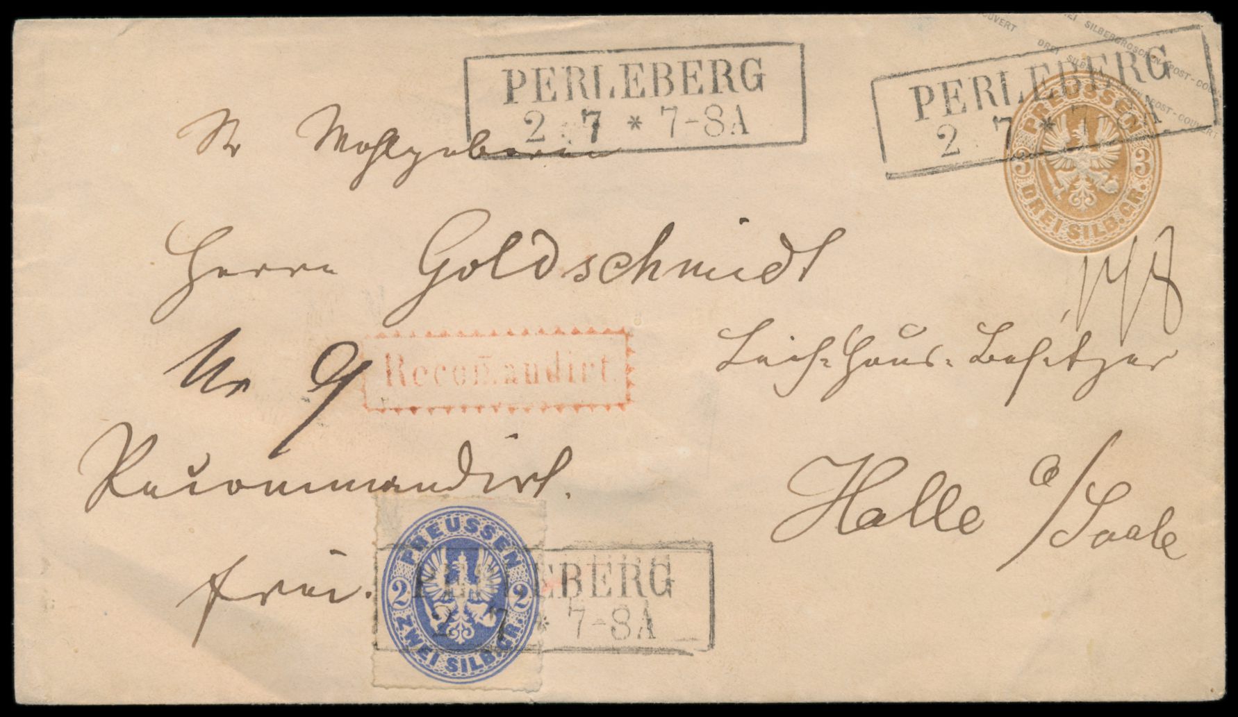 Ganzsachenumschlag 3 Sgr. mit Zusatzfrankatur 2 Sgr., R2 Perleberg 2.7., roter R1 Recommandirt, nach Halle, Ausg.-Stempel 3.7.