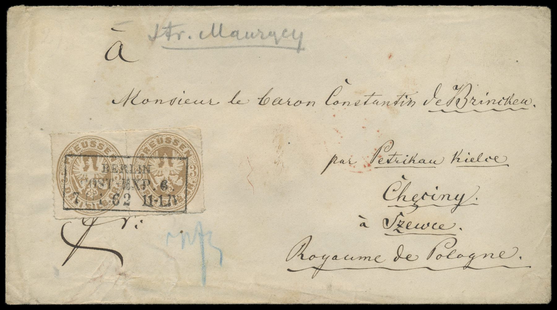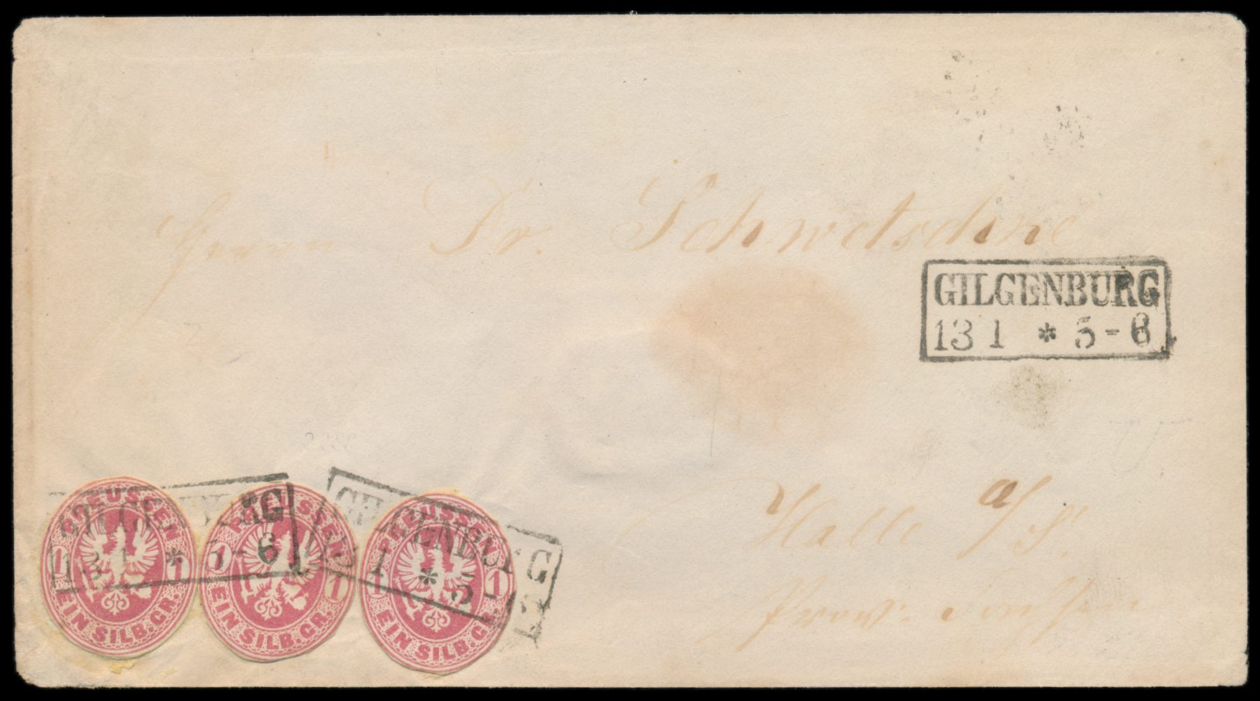 3 x Ganzsachenausschnitt 1 Sgr. oval geschnitten (ohne Überdruck) auf Briefumschlag, Stempel Gilgenburg 13.1., nach Halle, Ausg.-Stempel 15.1., Anschrift ist etwas verblasst
