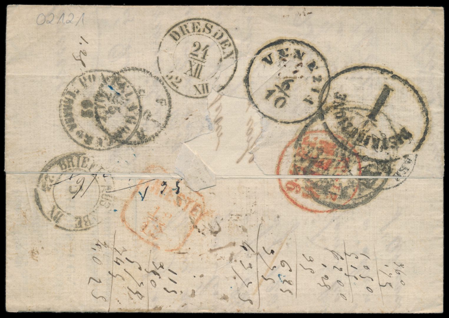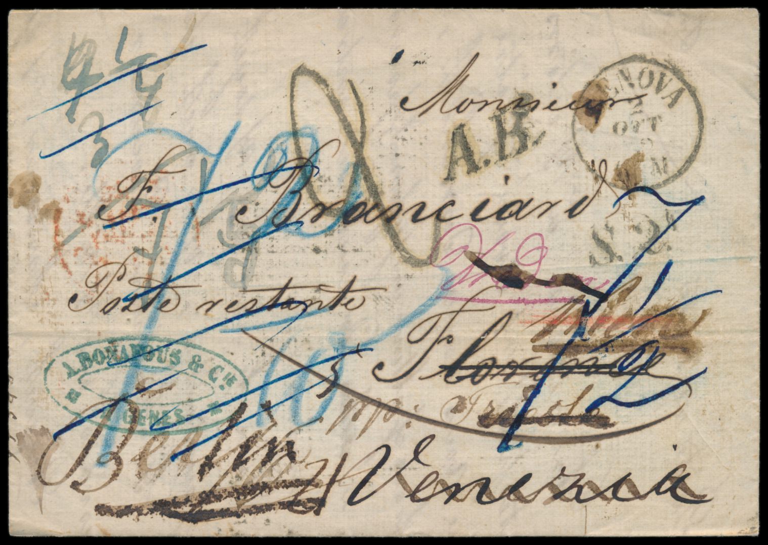 Faltbrief aus Genua 2.10.1862 mehrfach nachgesandt über Florino, Venezia, Triest, Wien und Dresden nach Berlin mit den entsprechenden Durchgangsstempeln und Portovermerken, mit komplettem Inhalt
