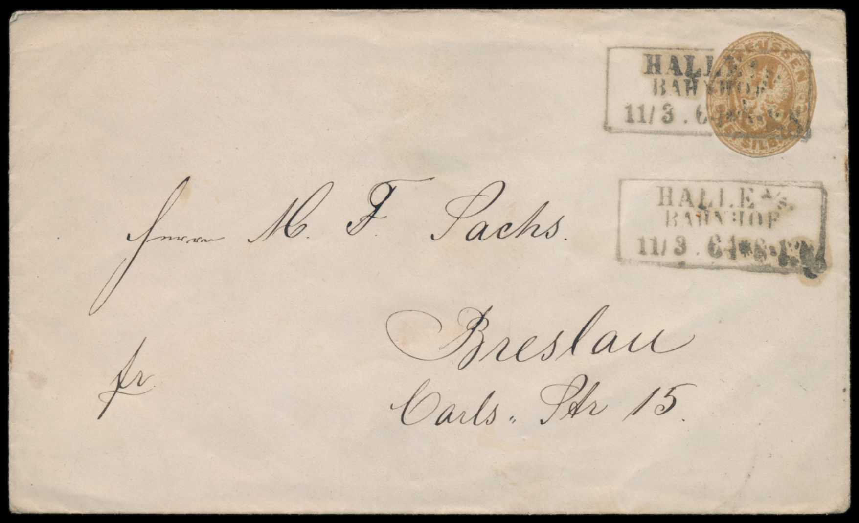 Briefumschlag mit entlang des Markenbildes geschnittener 3 Sgr.-Marke, R3 Halle Bahnof 11.3.64, nach Breslau, Ankunftstempel 12.3.