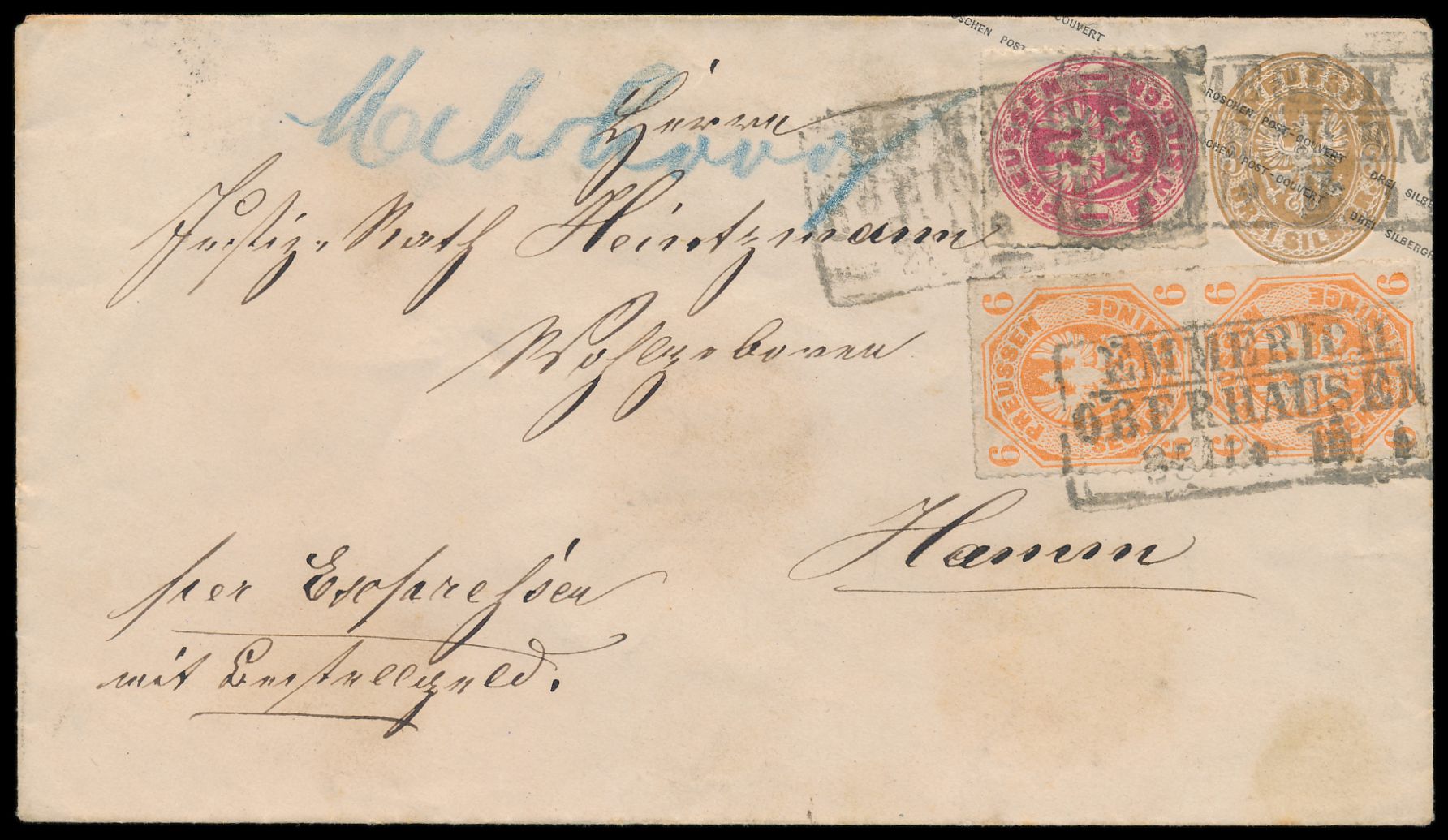 Ganzsachen-Umschlag 3 Sgr. mit Zusatzfrankatur 1 Sgr. Wappen und 2x 6 Pfg. Adler auf Eilbrief, "per Expressen mit Bestellgeld", Bahnpoststempel Emmerich - Oberhausen 25.11. III, handschriftliche Aufgabe Mehrhoog, nach Hamm