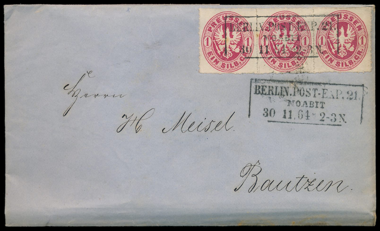 R3 Berlin. Post-Exp. 21 / Moabit 30.11.64, zwei Abschläge auf Faltbriefhülle mit waagerechtem Dreierstreifen 1 Sgr nach Bautzen, Ausgabe-Stempel 1.12.