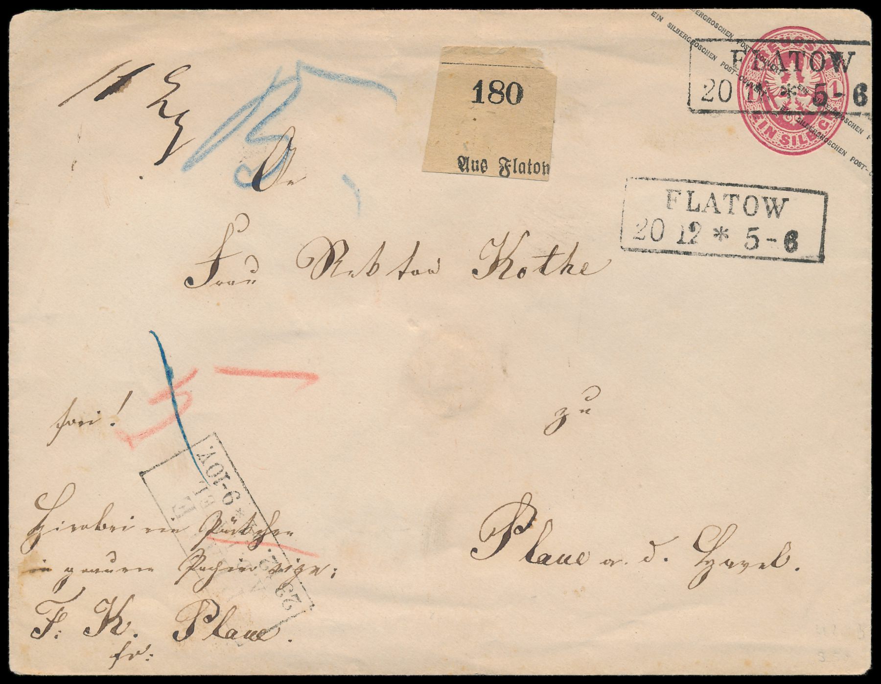 Ganzsache 1 Sgr (Großformat) als Paketbegleitbrief mit R2 Flatow 20.12. nach Plaue a. d. Havel, fehlende Gebühr von 5 Sgr bar bezahlt, links unten handschriftlich "5" Sgr in rot, vorderseitig R3 Plaue A. D. Havel 23.12.64, rückseitig Stempel Ausg. No. 1 23.12.