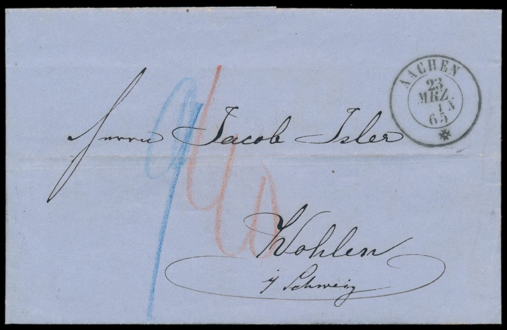 Versuchsstempel Aachen 23. Mrz. 65 mit einem Stern unten (belgische Type) auf unterfrankiertem Faltbrief in die Schweiz, handschriftliche Portovermerke, Ankunftstempel Wohlen 21.3.65, mit komplettem Inhalt
