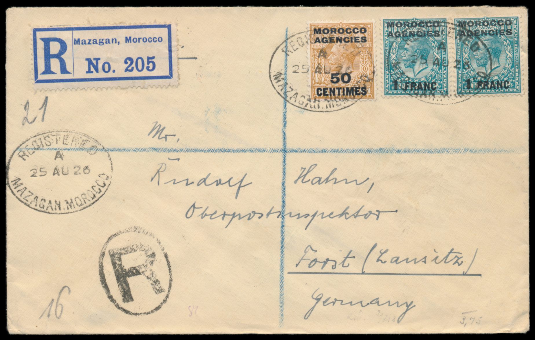 Morocco Agencies, 50 C. auf 5 d. und 2 x 1 Fr. auf 10 d. auf Einschreibbrief mit Stempel Registered Mazagan, Morocco 25.8.26, R-Ovalstempel und R-Zettel, nach Deutschland, Durchgangsstempel Registered British Post Office Casablanca 27.8.26, Ankunftstempel Forst 4.9.26