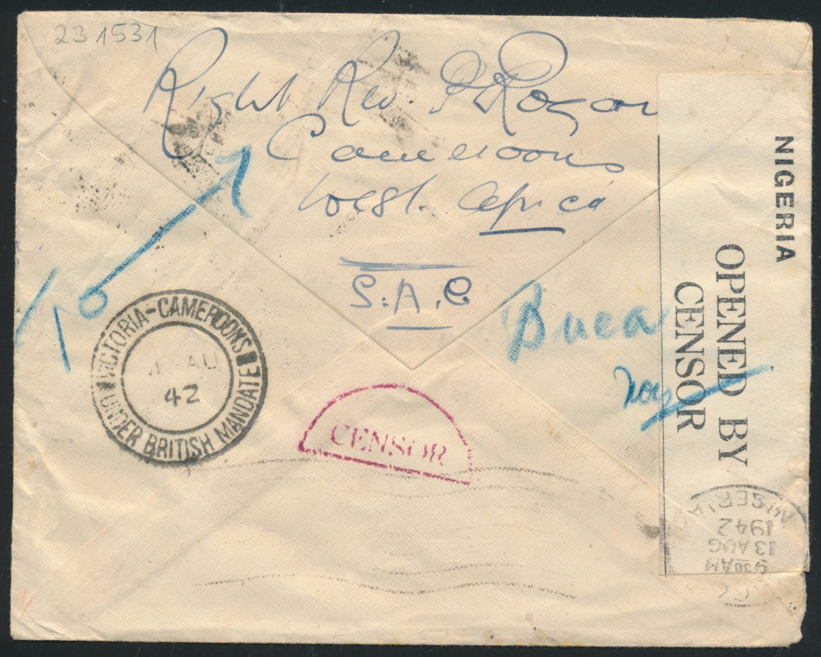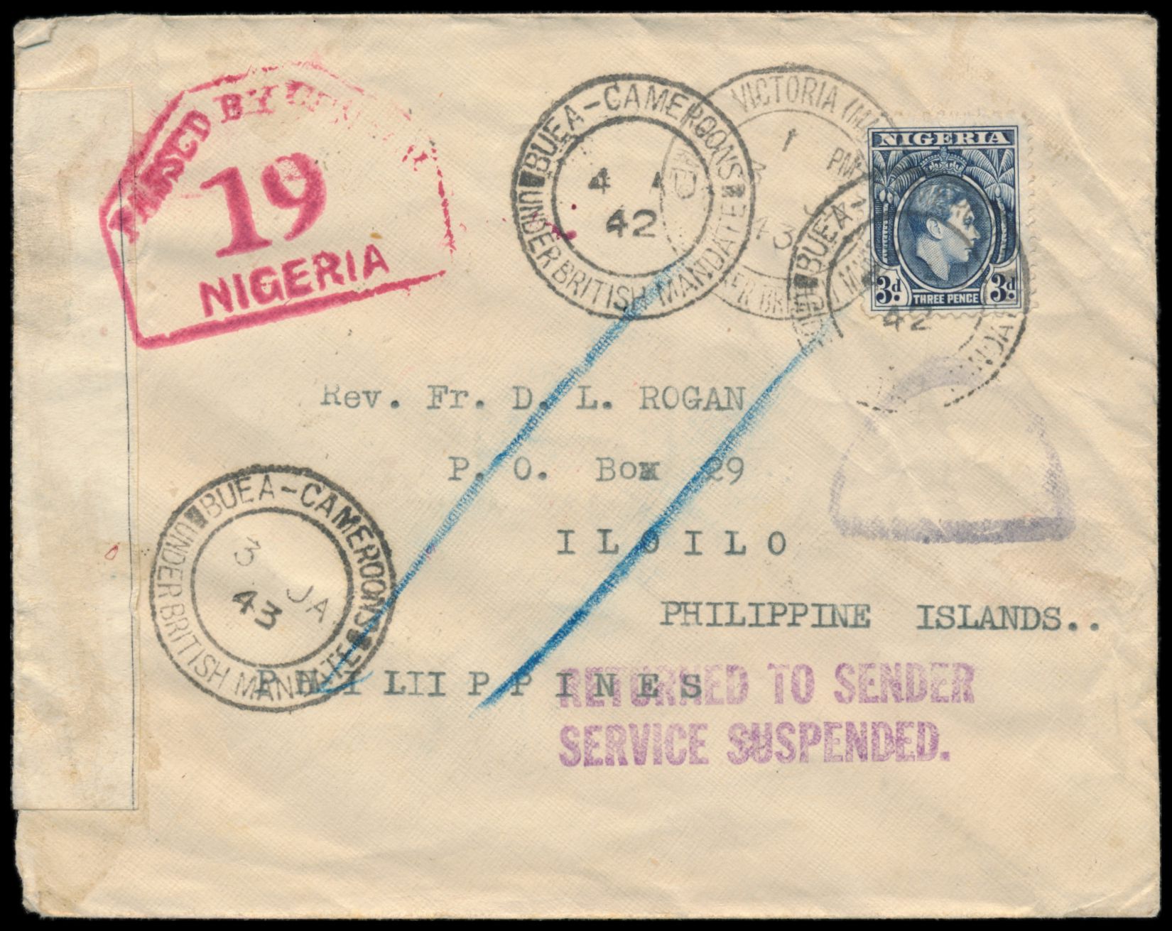 Nigeria, 3 d. auf Brief mit Stempel Buea - Cameroons under British Mandate 4.8.42 nach Iloilo / Philippinen, Durchgangsstempel Victoria 4.8.42, links Verschlußzettel "Nigeria / Opened by Censor" und roter Zensurstempel Passed by Censor 19 Nigeria, violetter L2 Returned to Sender / Service Suspended, Ankunftstempel Victoria und Buea 3.1.43