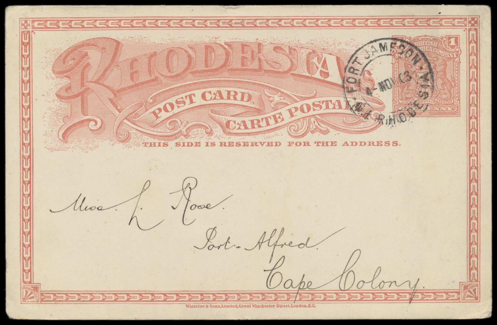 Nord-Rhodesien: Ganzsache 1 d. mit Stempel Fort Jameson N.E. Rhodesia 4.11.03 nach Port Alfred / Cape Colony, Bedarf